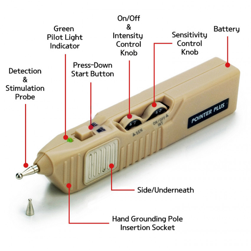 Akupunktúrne pero, Pointer Plus je inovatívny nástroj, ktorý vám umožňuje lokalizovať akupunktúrny bod a následne ho stimulovať pomocou elektrických impulzov, ktoré prechádzajú pokožkou priamo do tkaniva. Táto forma elektroakupunktúry je úplne neinvazívna a bezbolestná, čo ju robí ideálnou pre rušné kliniky aj pre začiatočníkov. Pomáha zmierniť príznaky chronickej bolesti aj bolesti po operáciách.