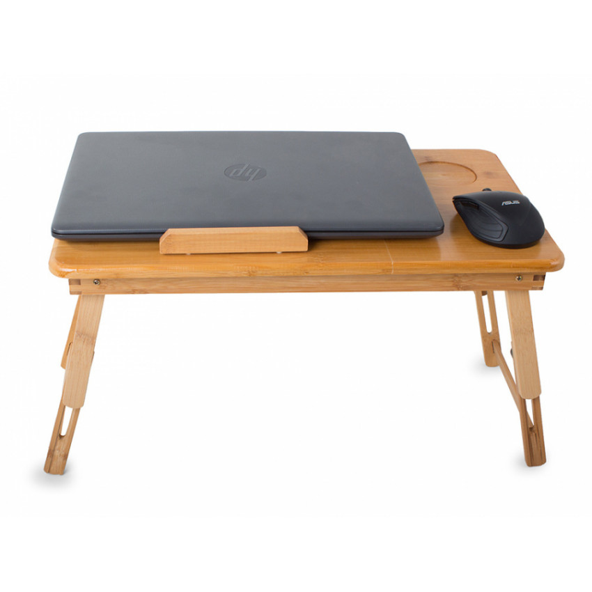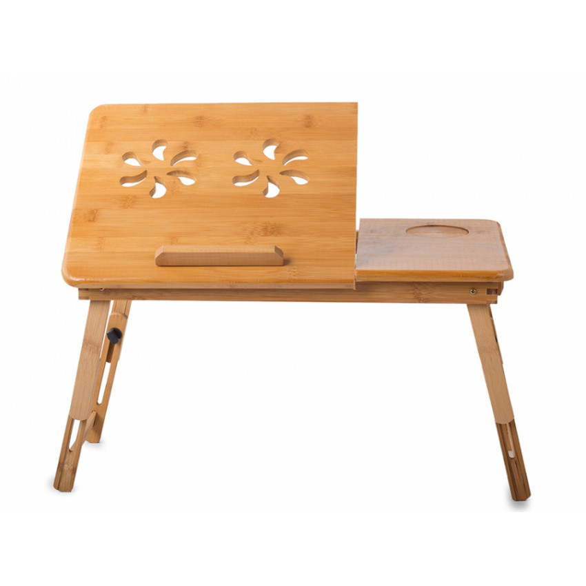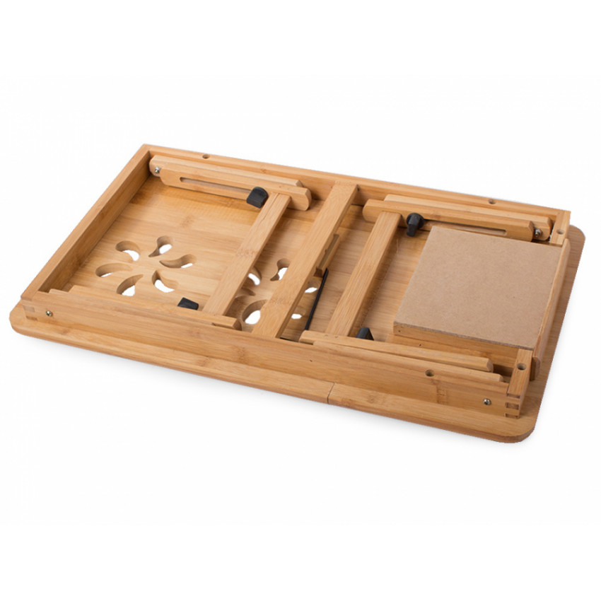 Skladací bambusový stolík s nastaviteľnou výškou a uhlom, ventiláciou proti prehrievaniu a zásuvkou na drobnosti. Protišmykový stojan a miesto na nápoj zaručujú pohodlie pri práci aj oddychu. Kompaktný a praktický doplnok pre notebook.
