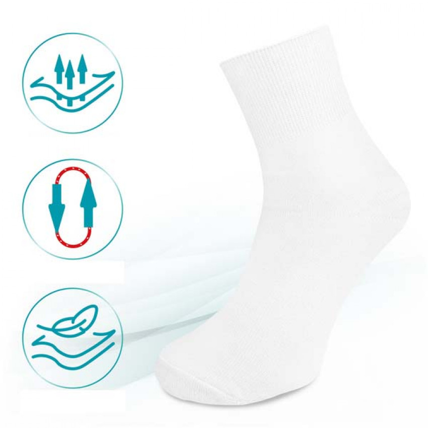 Minimalizujú tlak na chodidlá a lýtka, čím optimalizujú voľný prietok krvi a eliminujú tlak na citlivé oblasti chodidiel. Vyrobené z vysokokvalitnej česanej bavlny, zabezpečujú pohodlie a účinný odvod vlhkosti.