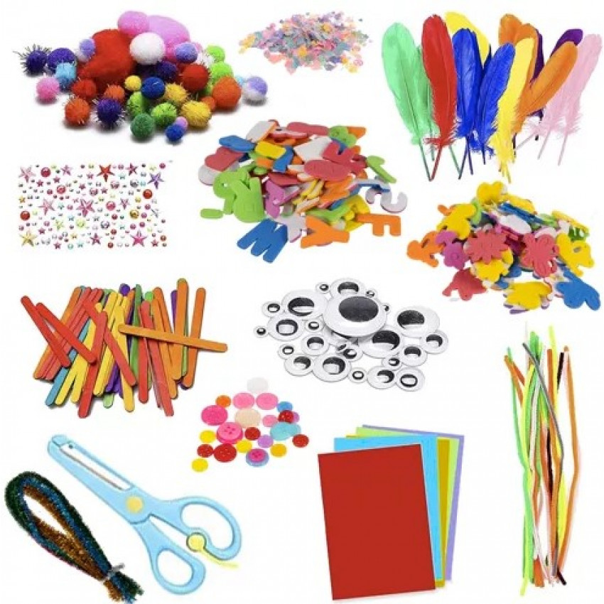 Sada obsahuje rôzne materiály, vrátane farebných pohľadníc, našuchorených drôtov, farebných drevených tyčiniek, farebných pier, nadýchaných brmbolcov v rôznych farbách a veľkostiach a mnoho ďalších.