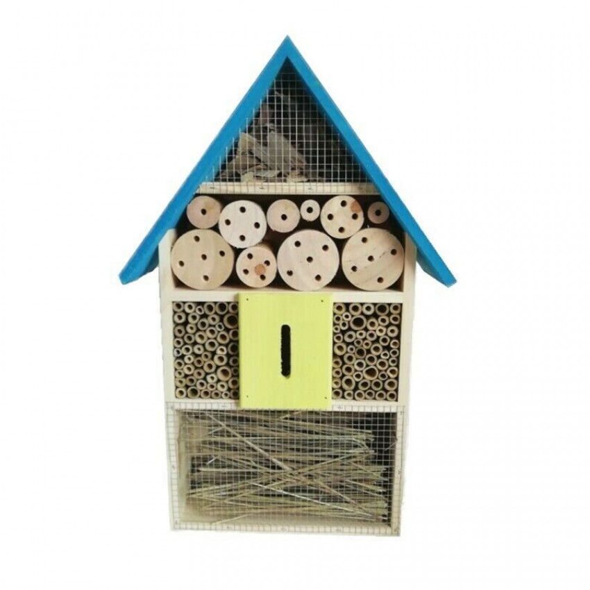 Tento domček, hotel s modrou strechou pre hmyz je ideálny ako hniezdisko a zimovisko pre včely a iný hmyz. Vhodné na záhradu, terasu alebo balkón so suspenziou. Domček je impregnovaný vôňou lesa aby prilákal hmyz na ubytovanie.