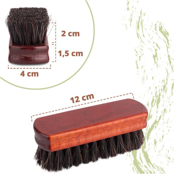 Drevené telo z bukového dreva a jemný konský vlas zaručujú dlhú životnosť, šetrné čistenie a kvalitné leštenie. Táto kefa na topánky je ideálna na pravidelnú starostlivosť o koženú obuv.