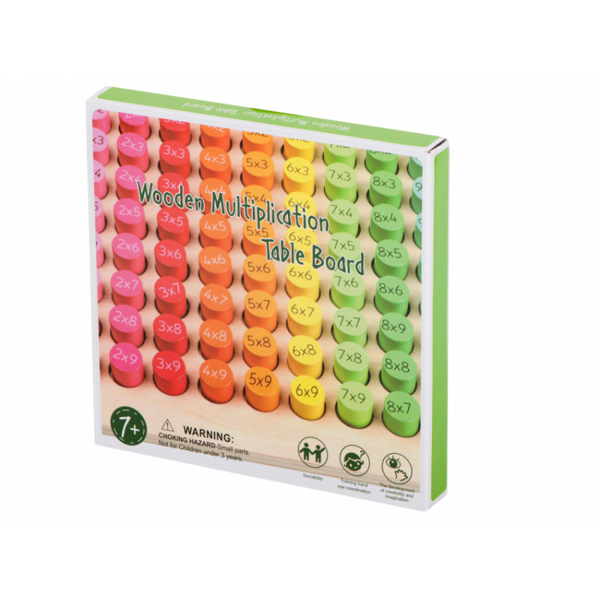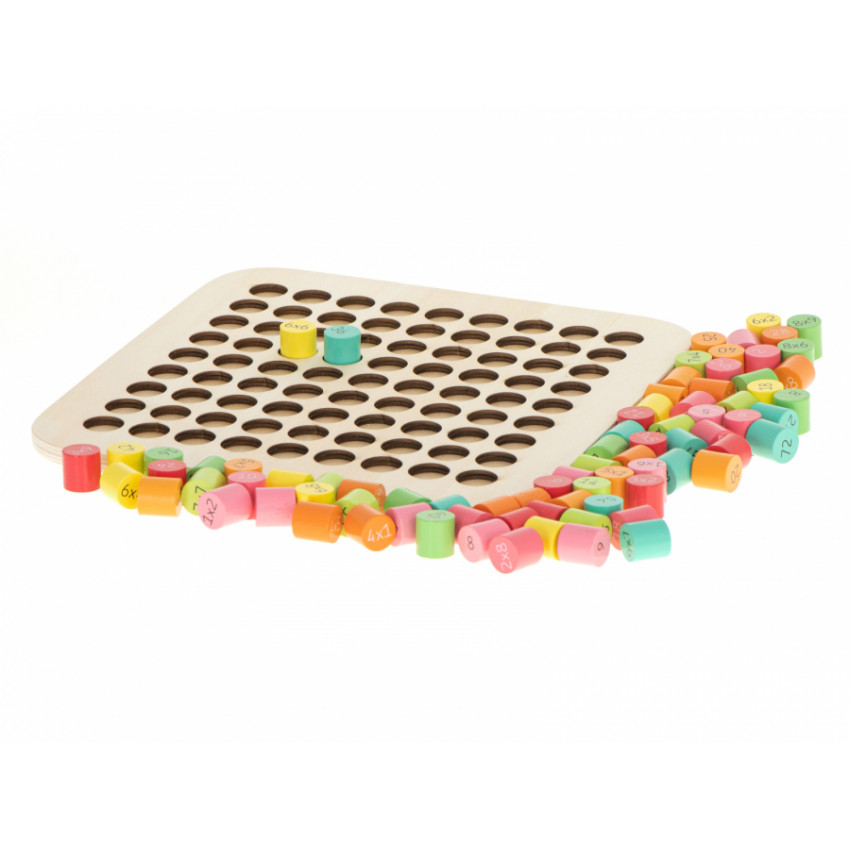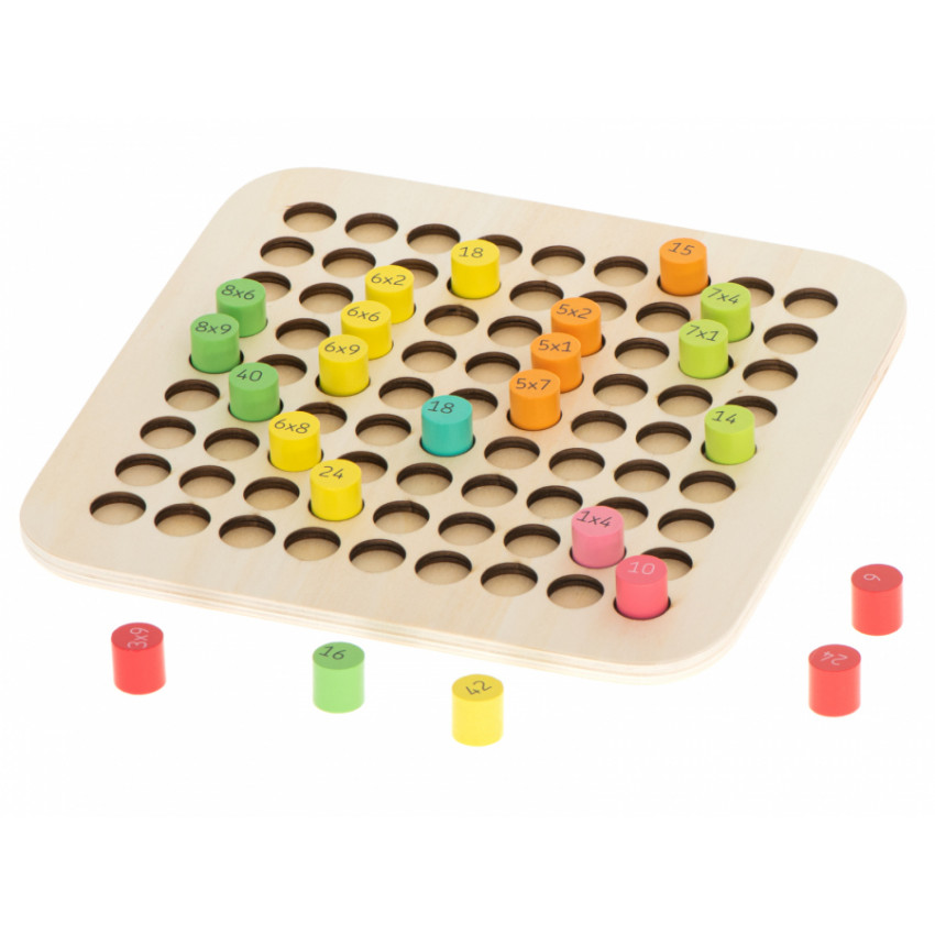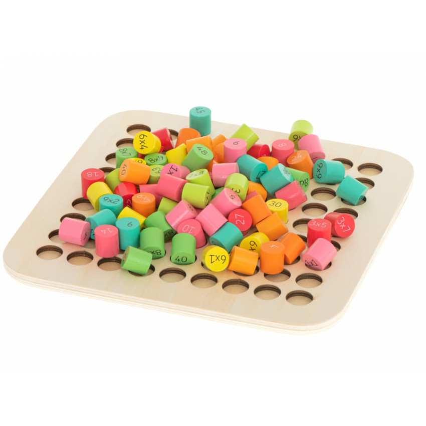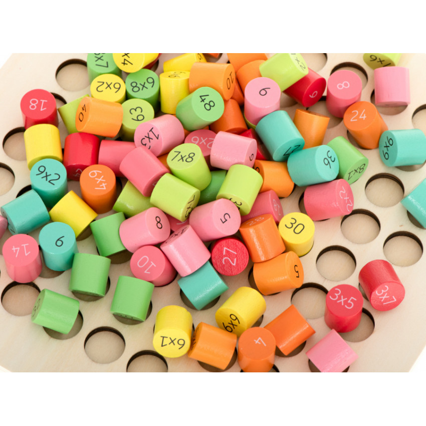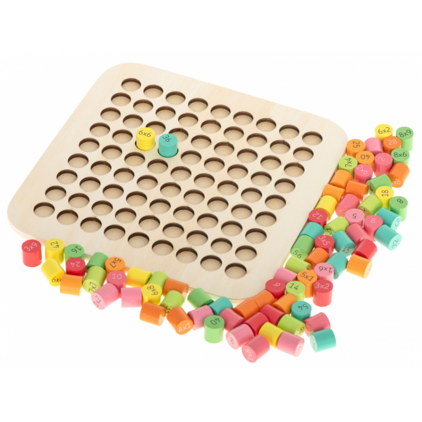 Fantastická drevená vzdelávacia súprava, ktorá pomôže vášmu dieťaťu naučiť sa násobilku. Drevená doska obsahuje 81 rôzne zafarbených drevených valcov. Jedna strana valca má funkciu príkladu a druhá strana skrýva správny výsledok. Zábava a učenie v jednom. Perfektné na trénovanie pamäti a koncentrácie.