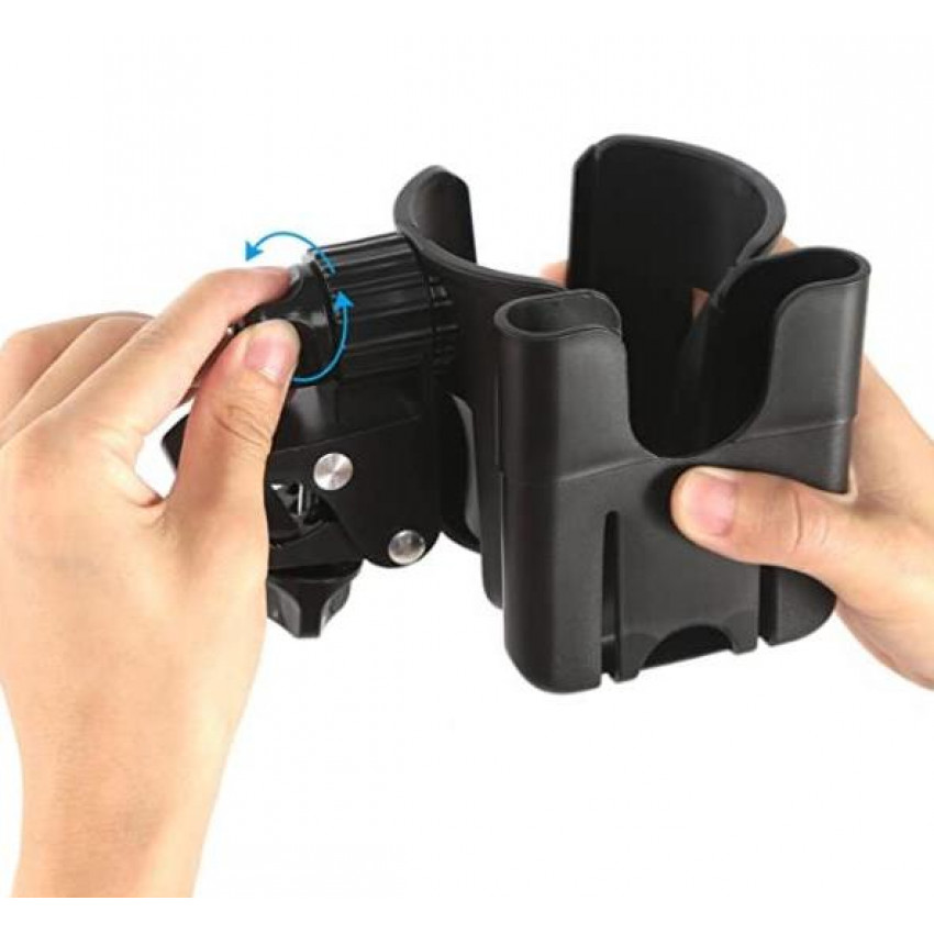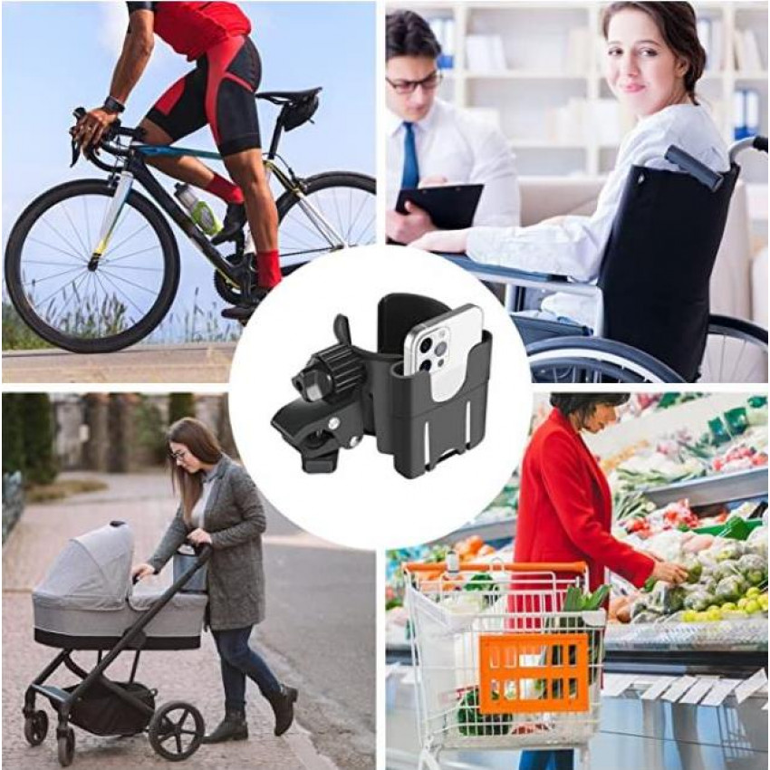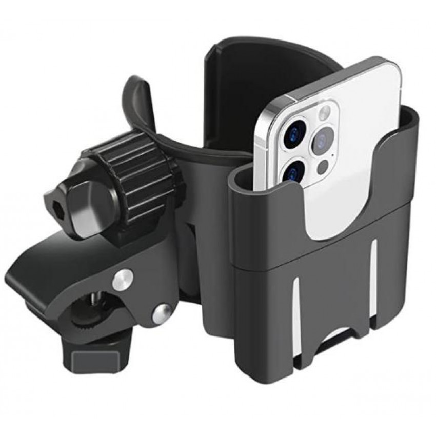 Držiak na pohár a telefón na pripevnenie na bicykel, kočík, invalidný vozík a pod. Vďaka držiaku môžete mať termosku s obľúbeným nápojom a telefón vždy po ruke. Držiak sa ľahko inštaluje a pasuje na väčšinu štandardných riadidiel na bicykel alebo kočík.