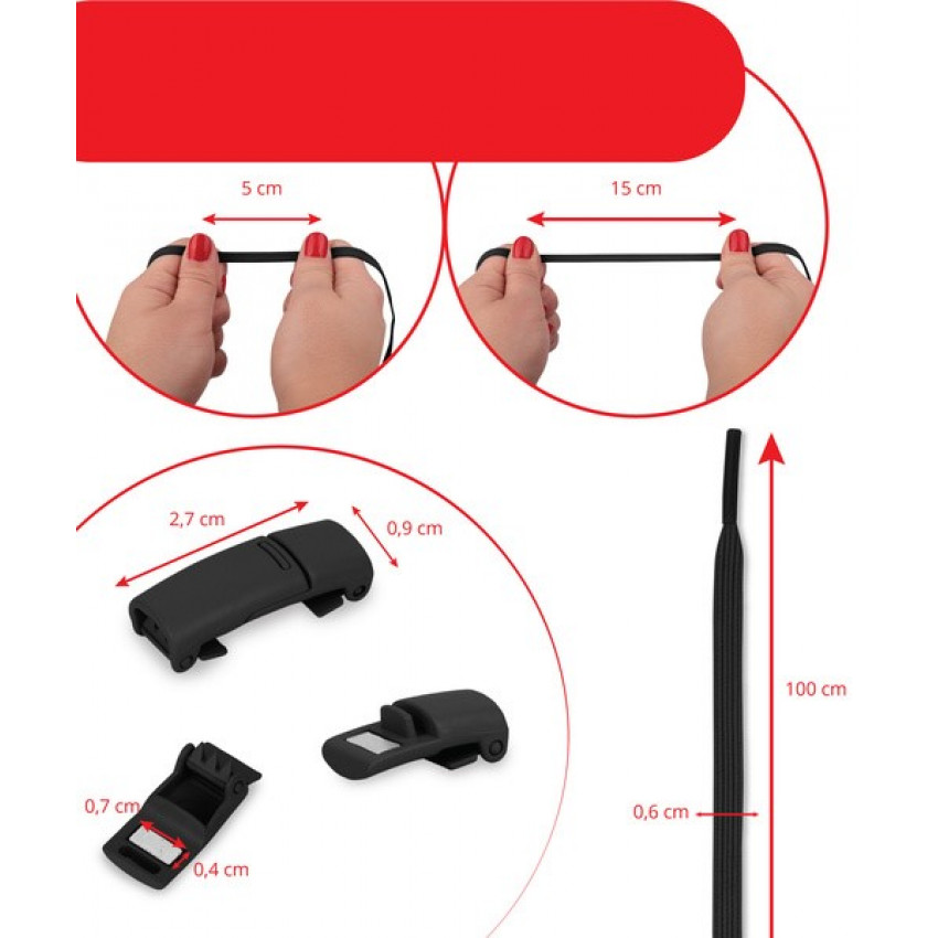 Šnúrky sú pružné a na konci majú silnú pracku, vďaka ktorej budú šnúrky pôsobiť esteticky. Oba prvky spony majú silné magnety, ktoré obe spony k sebe priťahujú a bránia ich rozopínaniu.