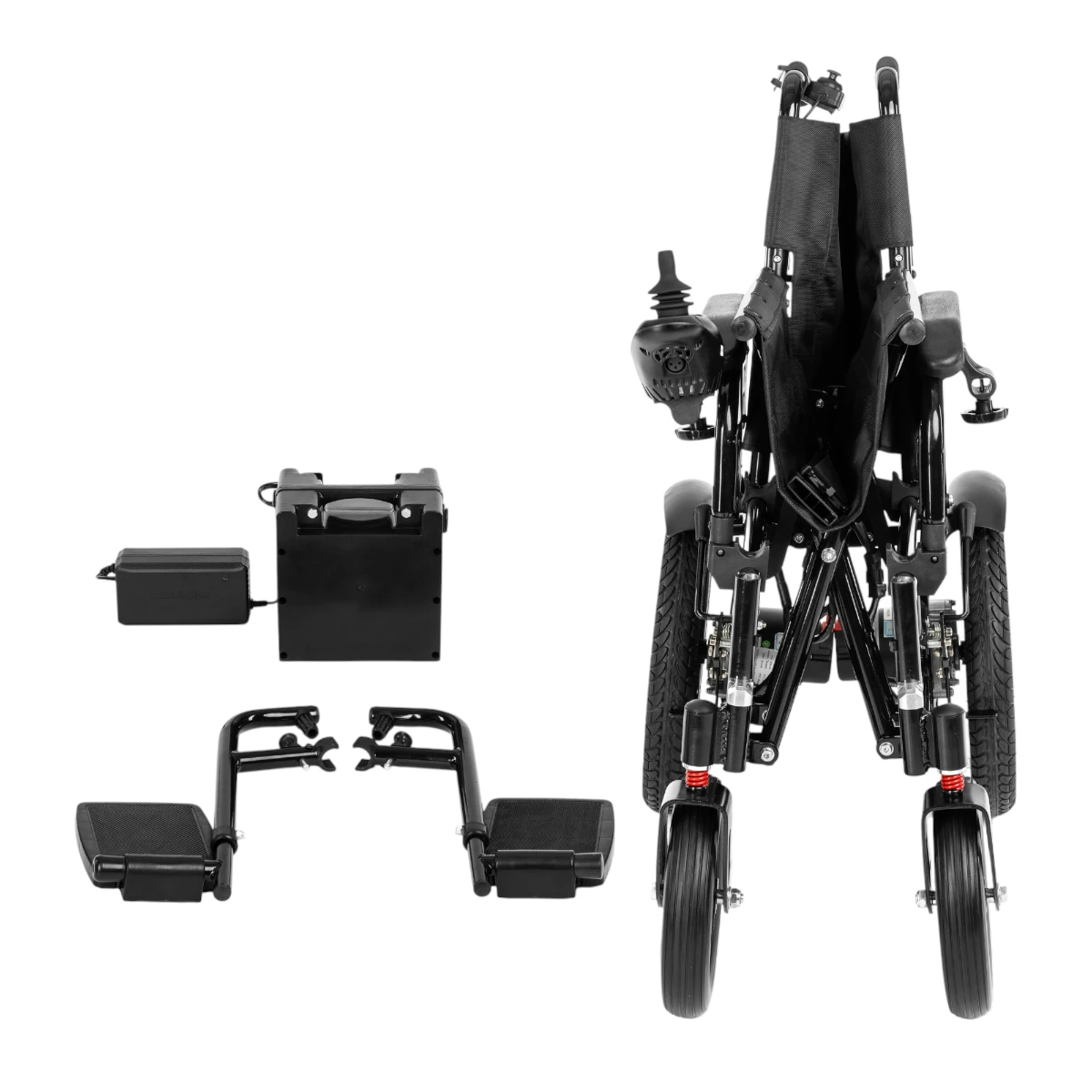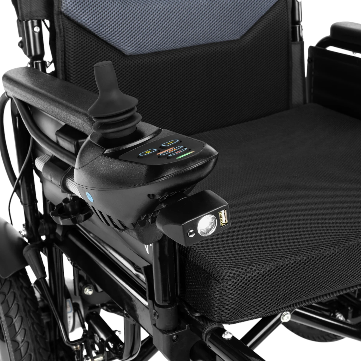 Vozík je vybavený výkonnými motormi 2x250 W, ktoré zabezpečujú plynulú jazdu aj v náročnejších podmienkach. Ovládanie joystickom je intuitívne a presné, doplnené o podsvietené ovládacie prvky, klaksón a reguláciu rýchlosti. Nechýba ani systém antivývrtových kolies a bezpečnostný pás, ktoré zvyšujú stabilitu a bezpečnosť počas jazdy.