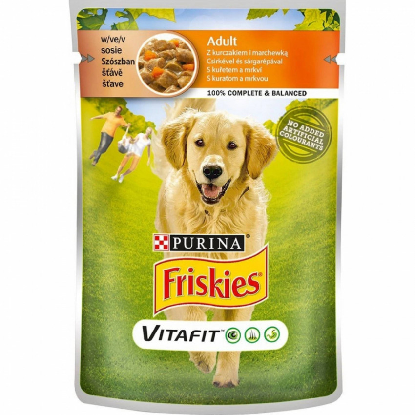 PURINA FRISKIES VitaFit: pre psa plného vitality! Už viac ako 80 rokov PURINA® FRISKIES® pomáha udržať generácie rodinných psov šťastných a plných vitality. Milujete svojho psa pre radosť, ktorú prináša do Vašej rodiny, a preto si chcete byť istý, že je vždy spokojný, šťastný a plný vitality! Z tohto dôvodu veterinári a špecialisti na výživu spoločnosti PURINA® vyvinuli PURINA® FRISKIES® VitaFit chutné kompletné receptúry, ktoré poskytujú Vášmu psovi vitamíny a ostatné výživné látky, ktoré potrebuje k zdraviu. Kapsička FRISKIES ADULT s kuraťom a mrkvou v šťave je kompletné krmivo pre dospelých psov. Kapsičky sú zdrojom kvalitných bielkovín a ďalších živín.