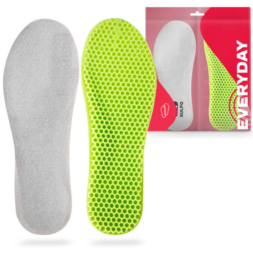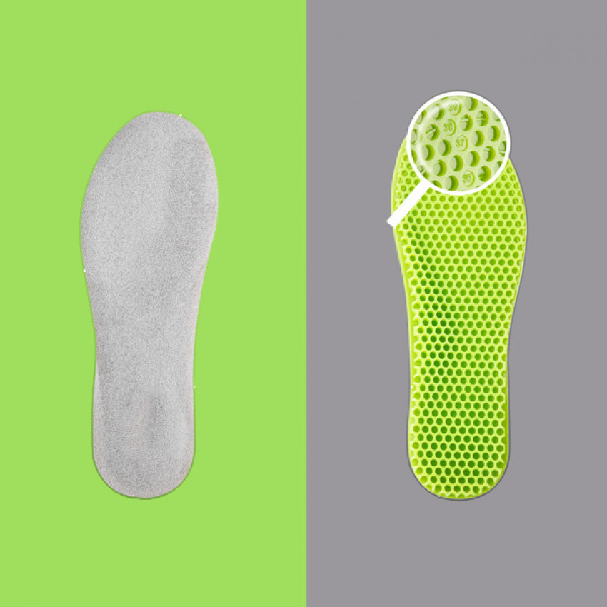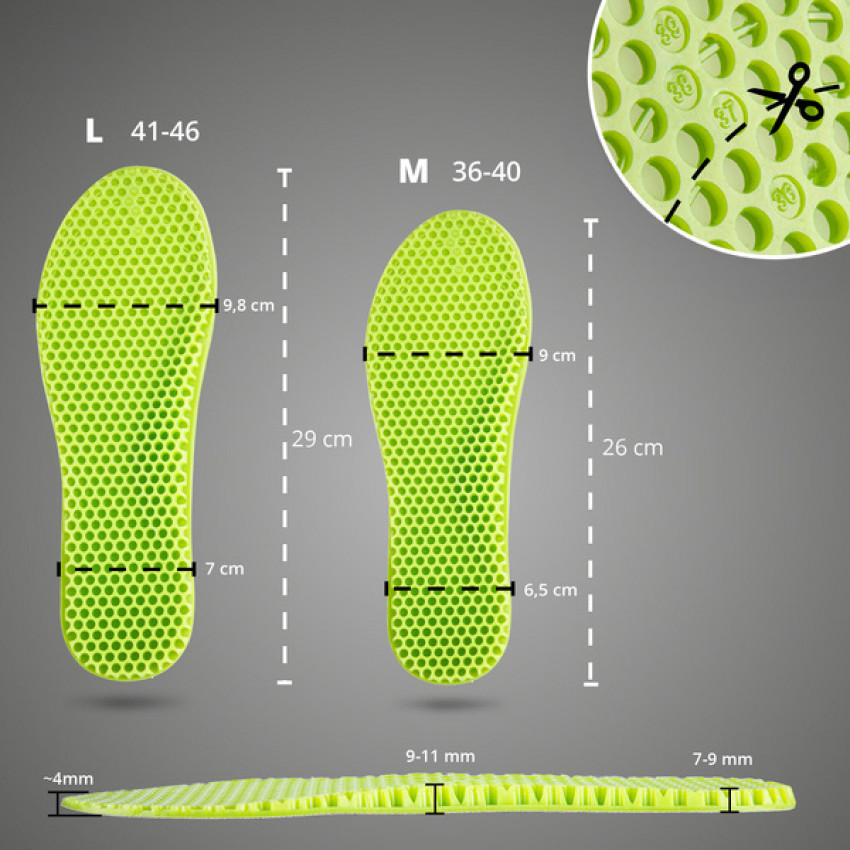 Gélové vložky s mäkkým silikónovým jadrom absorbujú nárazy, znižujú únavu nôh a prispôsobia sa veľkosti vďaka samostrihacím líniám. Velúrový povrch zaručí pohodlie pri každodennom nosení v akýchkoľvek topánkach.