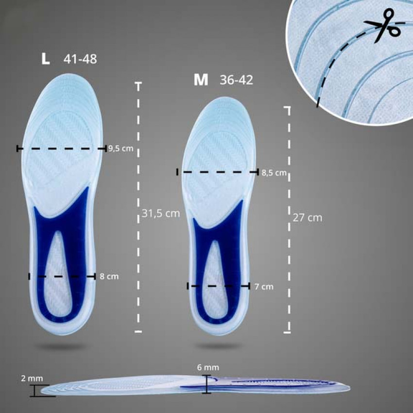 Gélové vložky sú univerzálne a možno ich voľne používať vo všetkých druhoch obuvi. Sú ideálne na fyzické aktivity, každodenné voľnočasové aktivity, ako aj do elegantnej obuvi, napríklad papúč.