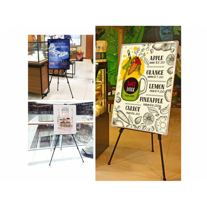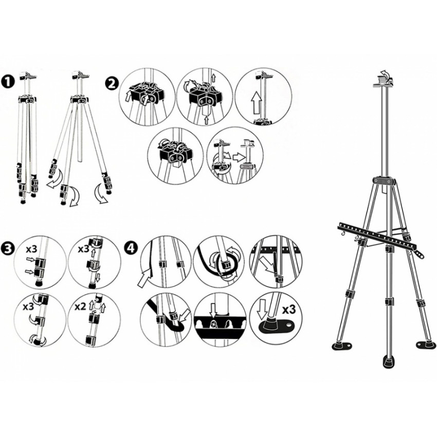 Ľahký a stabilný stojan je vyrobený z hliníka. Má 3-segmentové nastaviteľné nohy, takže každý rám obrazu viete prispôsobiť stojanu. Nohy sú zakončené samonivelačnými protišmykovými prvkami, takže stojan je chránený proti pádu pri práci a poškriabaniu podlahy.