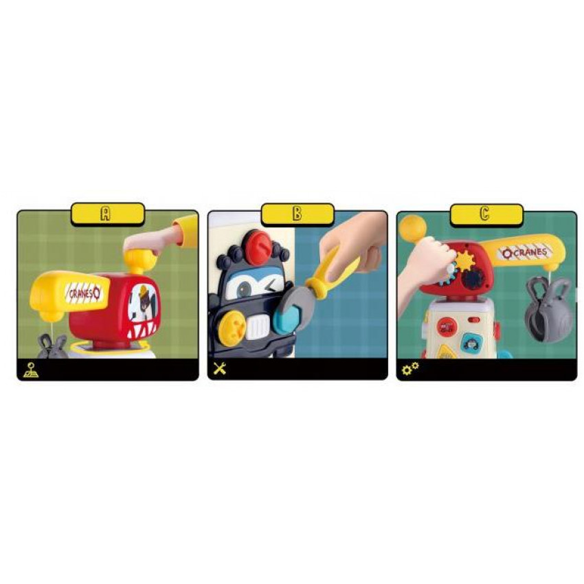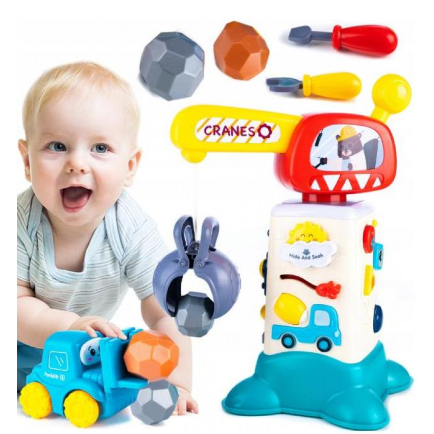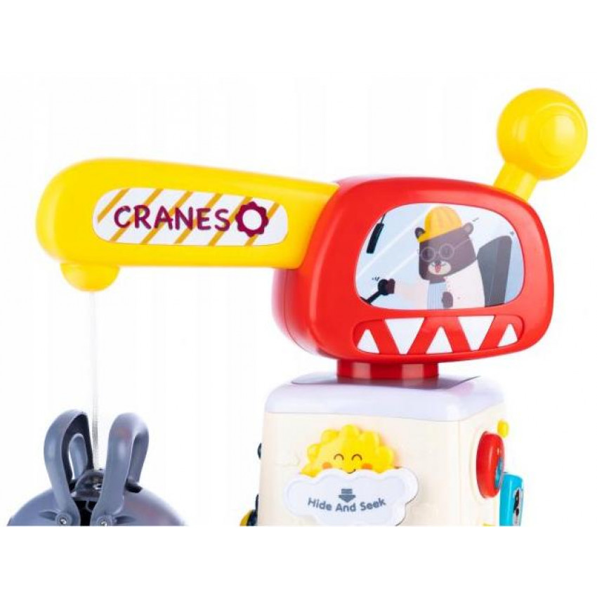 Interaktívny žeriav s vysokozdvižným vozíkom a imitáciou balvanov na zdvíhanie. Hračka je vybavená ručným mechanizmom na spúšťanie a zdvíhanie chápadla a otočnou vežou. Každá zo stien má farebné hracie prvky.