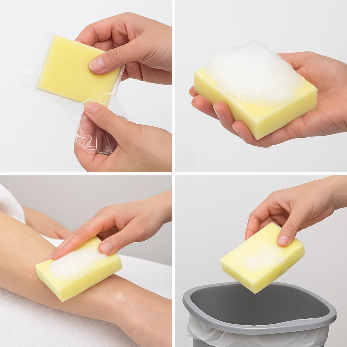 Delikátna umývacia špongia s penou na rýchlu a hygienickú starostlivosť o celé telo. Vhodná aj pre citlivú pokožku a novorodencov, testovaná dermatologicky. Jednorazová, praktická, bez potreby oplachovania.