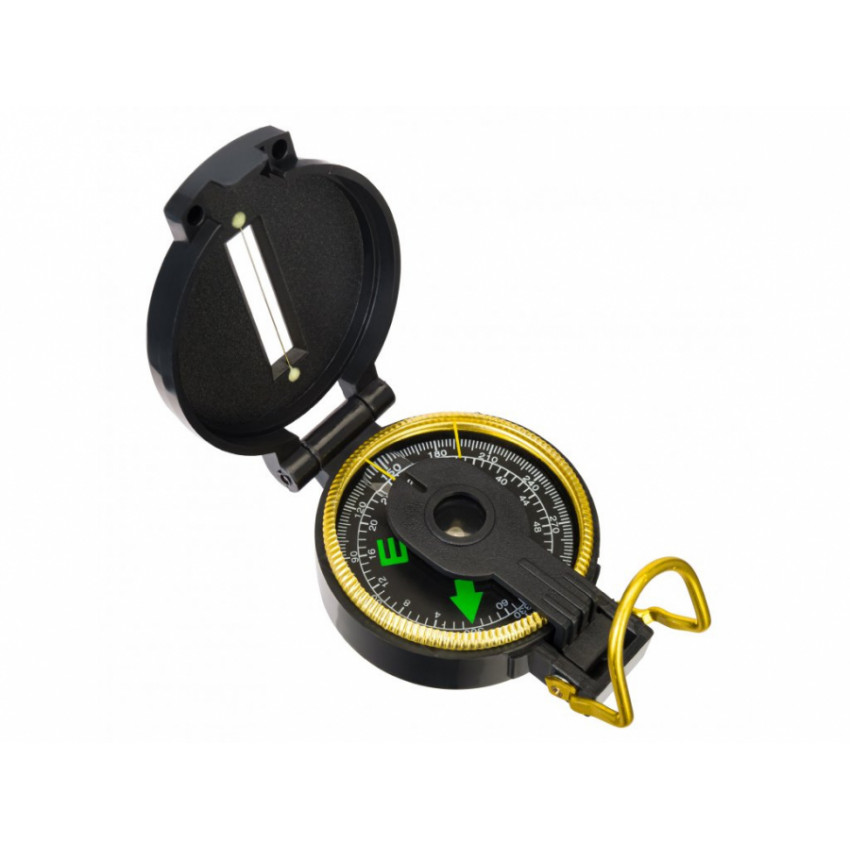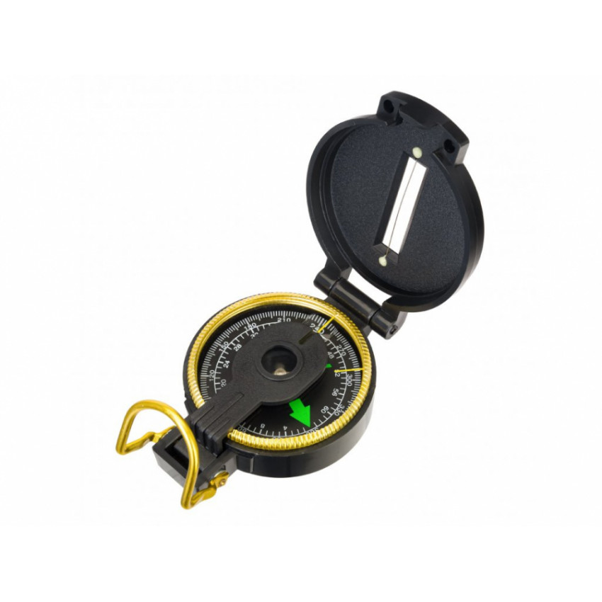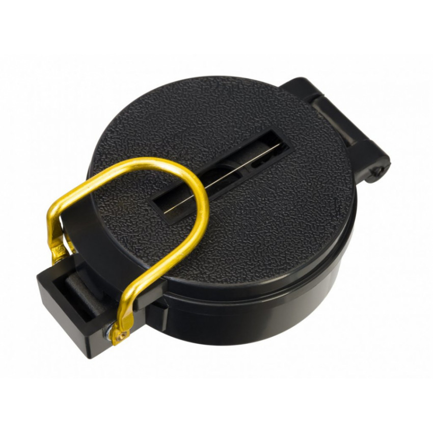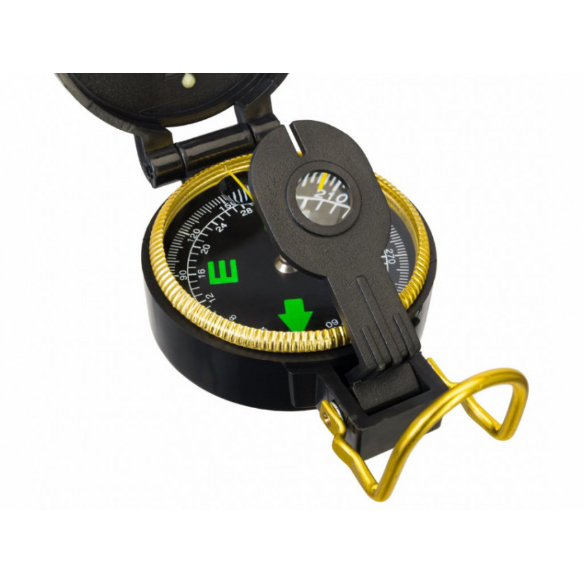 Kvapalinový kompas so strelkou smerujúcou k severu. Skladací dizajn. Doplnený štrbinou zameriavača a zameriavacím drôtom. Strelka je uložená v kvapaline, lupa na buzole slúži pre lepšie odčítanie zo stupnice, vlas pre presnejšie zameranie bodu.