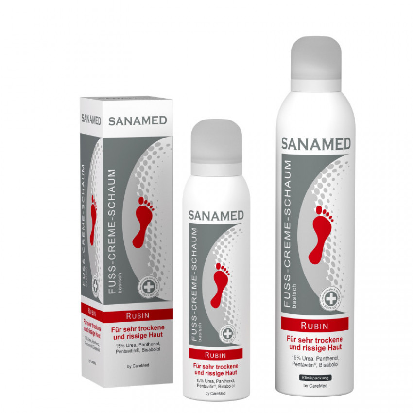 SANAMED "Rubín" je určený pre starostlivosť o chodidlá pre veľmi suchú až popraskanú pokožku. Rýchlo sa vstrebávajúca krémová pena obsahuje upokojujúce zložky ako je urea, panthenol, pentavitin®, bisabolol a mnoho ďalších vysokokvalitných zložiek. 15%-ny podiel urey zaručuje citeľné zmäkčenie a vyhladenie zhrubnutej kože. Bez prísad PEG, vôní, farbív a konzervačných látok je pena vhodná aj pre diabetikov. SANAMED "Rubín" poskytuje pokožke potrebnú starostlivosť a hydratuje ju bez ovplyvnenia prirodzenej ochrannej bariéry kože.