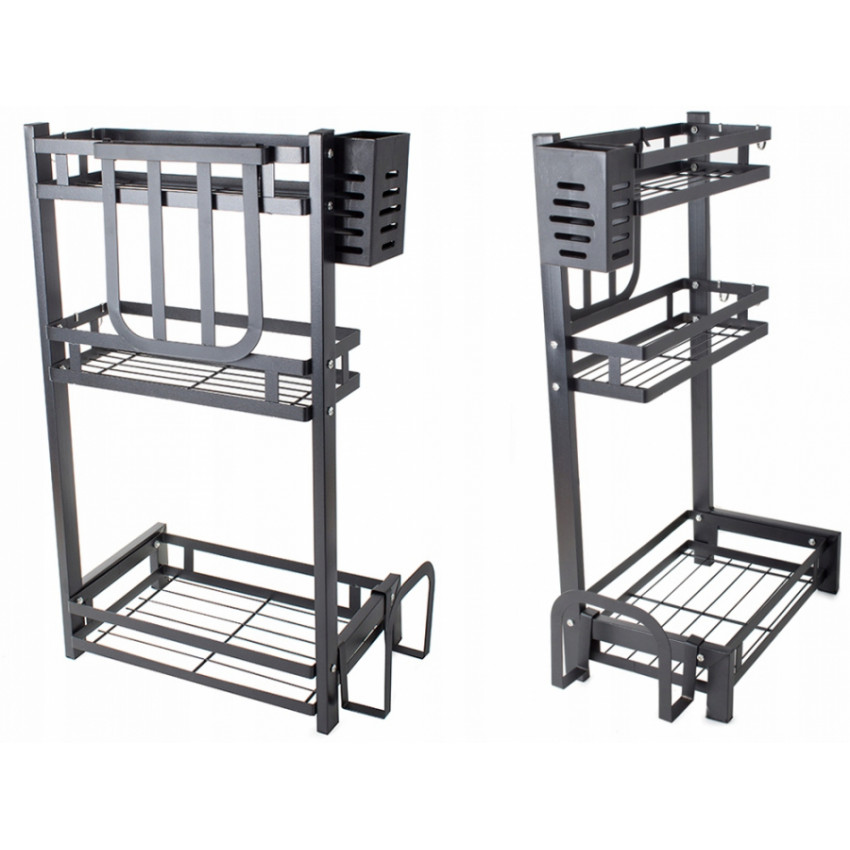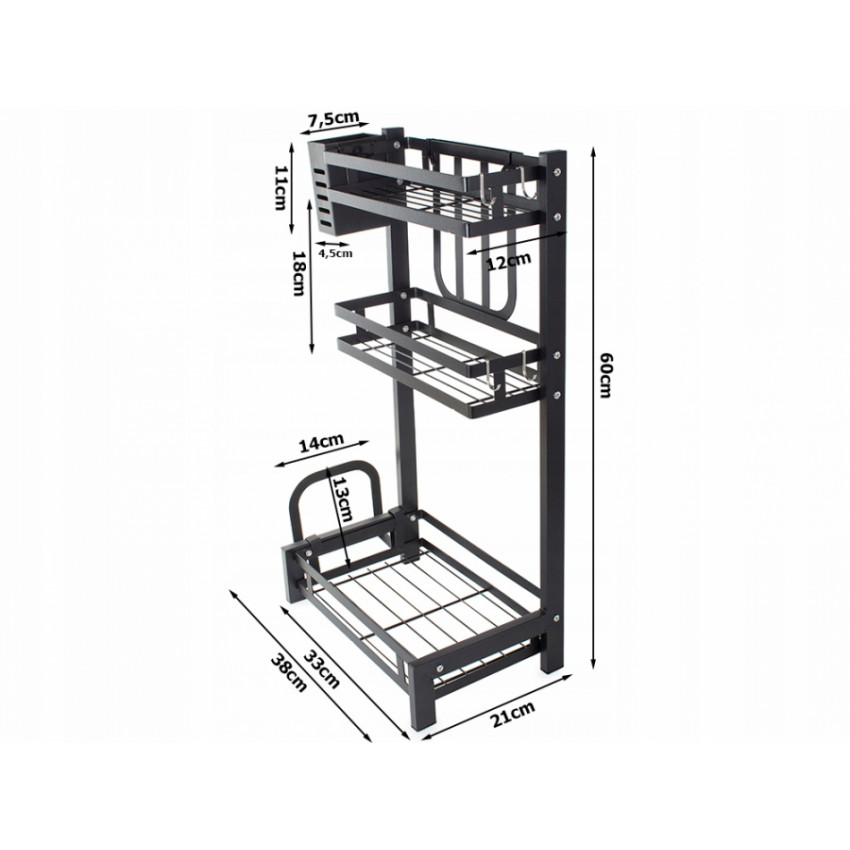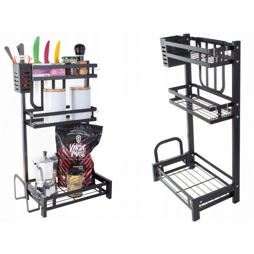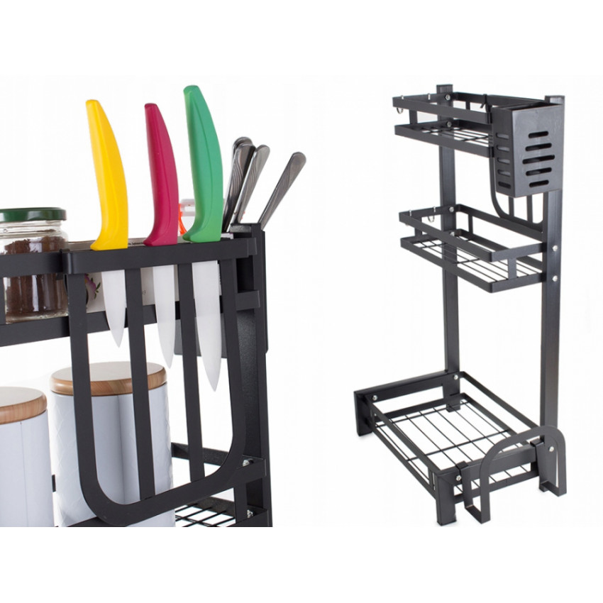 Praktický trojpoličkový organizér z kovu s práškovým nástrekom. Obsahuje odnímateľný držiak na nože a príbory, 4 vešiaky na kuchynské náradie a poličku na dosky. Stabilný, priestranný a štýlový doplnok do kuchyne.