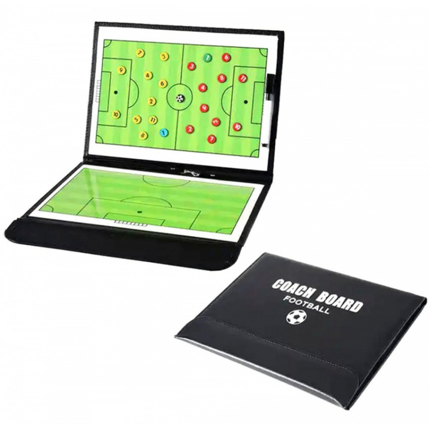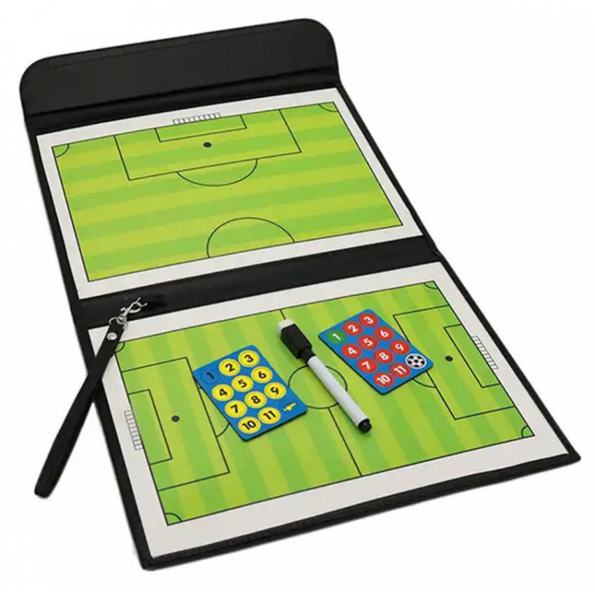 Tabuľa je elegantne určená vo forme priečinka so zapínaním na suchý zips, čo umožňuje jej bezpečné zatvorenie a ochranu obsahu. Vnútri nájdete dve magnetické tabule, ktoré zobrazujú hracie pole a umožňujú trénerom pohodlne a presne nastavovať herné formácie a stratégie. Komplet sa dodáva so zmazateľným popisovačom a súpravou 24 magnetov, zahrňujúcich čísla hráčov a symboly pre loptu, čo rozširuje možnosti plánovania a diskusie o taktike.