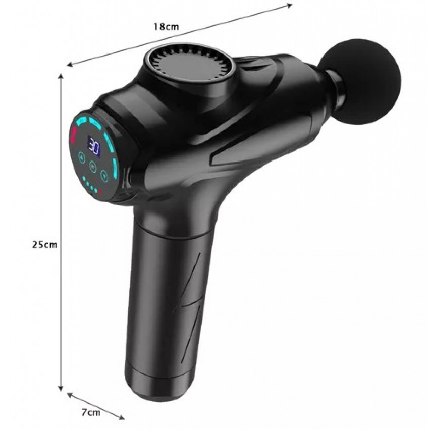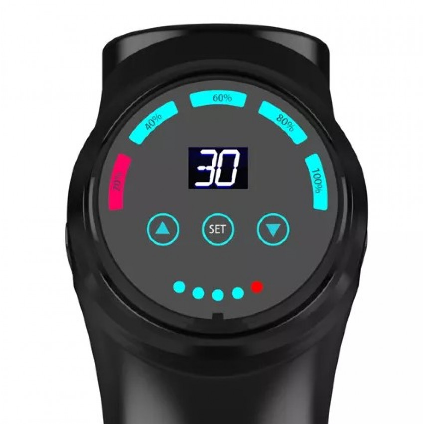 Pištoľ má až 30 stupňov intenzity masáže! Ide o veľmi veľký rozsah, ktorý vám umožňuje individuálne prispôsobiť rýchlosť svalom, v ktorých sa má použiť. Pištoľ má prehľadný displej, ktorý zobrazuje danú úroveň, takže nad ňou máte neustálu kontrolu. Intenzita práce sa mení pomocou citlivého dotykového panela, stačí sa ho jemne dotknúť.