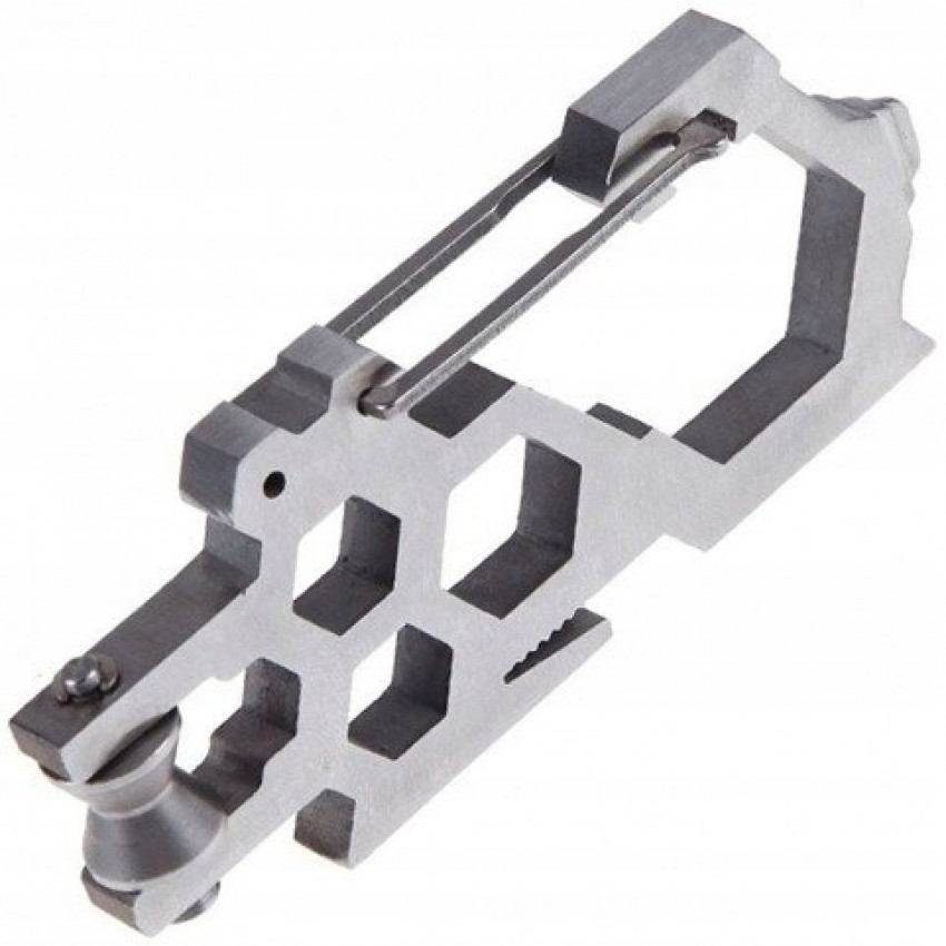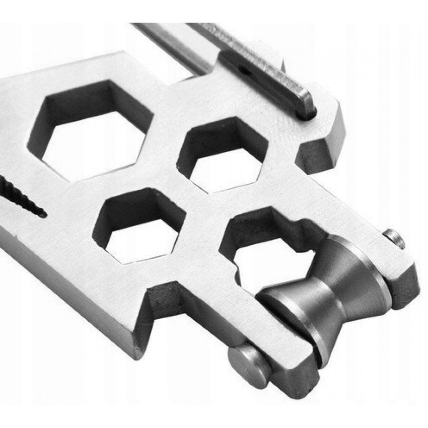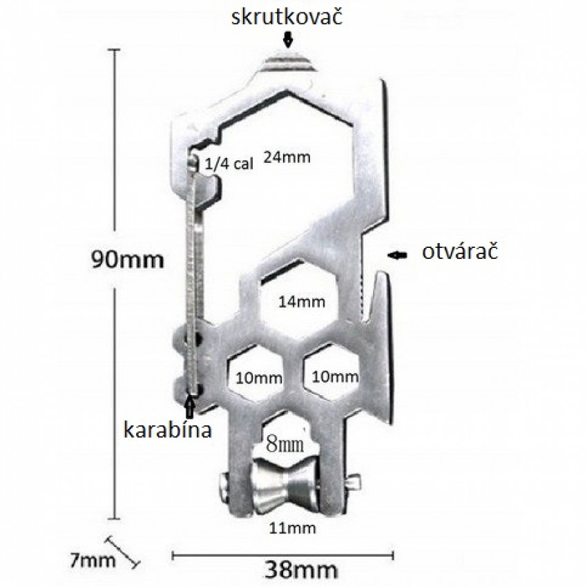 Turistická a každodenná nevyhnutnosť v podobe oceľovej kľúčenky, ktorá sa zmestí do vrecka. Pomáha v každodenných situáciách, napríklad pri otváraní fľaše alebo uťahovaní skrutiek. Je to multifunkčný nástroj, ktorý vám umožní zvládnuť veľkú sadu kľúčov. Zároveň poskytuje súbor základných nástrojov, ktoré sú často užitočné na dennej báze doma, v práci aj na cestách. Oceľová karabína na kľúče je vyrobená z nerezovej ocele, rezaná laserom a vybavená silnou nerezovou západkou.