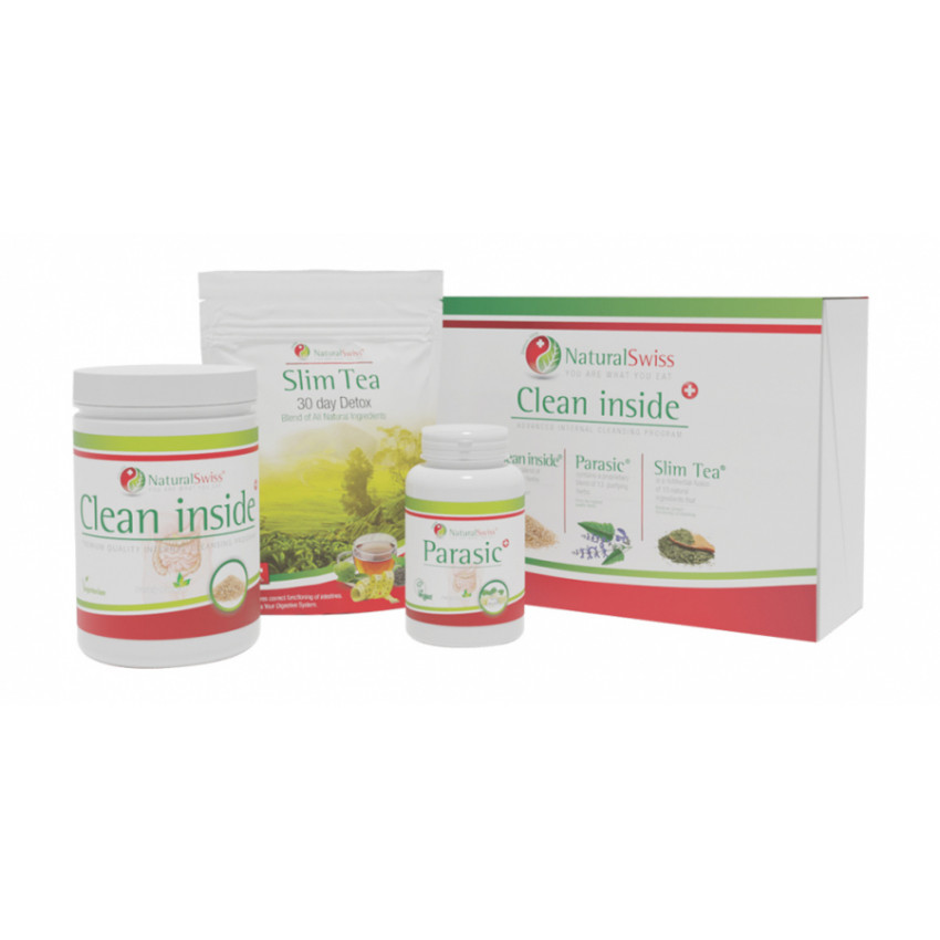 Program CleanInside je kombináciou troch produktov, ktoré obsahujú starostlivo vyberané prírodné rastlinné zložky, ktorými sú Parasic kapsuly, vlákninový prípravok CleanInside a liečivý čaj Slim Tea. Komplexná kúra na očistu čreva a detoxikáciu od NaturalSwiss pozostáva zo sady produktov programu Clean Inside a programu ToXiClean. Pri vytvorení programu Clean Inside bolo naším cieľom zostaviť produktovú kombináciu, ktorej členovia synergicky vyvíjajú a vzájomne posilňujú svoje prospešné zdravotné účinky v záujme dôkladnej a prírodnej očisty hrubého čreva.