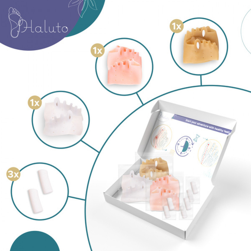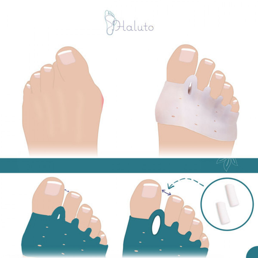 Navrhnuté na ochranu a zakrytie halluxov počas každodenných aktivít a športu. Priložený malý klin umožňuje zväčšenie priestoru medzi prstami, čo je ideálne pre ľudí trpiacich na bolesti a deformity spojené s halluxami.