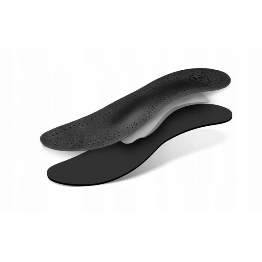 Kožené ortopedické pohodlné stielky do obuvi pre ľudí s bolesťou spojenou so zníženou priečnou a pozdĺžnou klenbou. Sú vyrobené z prírodnej rastlinne vyčinenej čiernej usne a vrstvy latexovej peny s aktívnym uhlíkom. Prírodná čierna useň ľahko absorbuje pot vylučovaný chodidlom a aktívne uhlie neutralizuje nepríjemný zápach, vďaka čomu je obuv čistá a hygienická počas dlhej doby. Medzi materiálmi je prilepený mäkký profilovaný prvok z latexovej peny. Profilovaný prvok pozostávajúci z podpory metatarzálnej a pozdĺžnej klenby, súčastne priaznivo mení rozloženie tlaku na chodidle. Sú vhodné do všetkých druhov obuv.