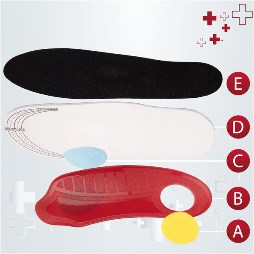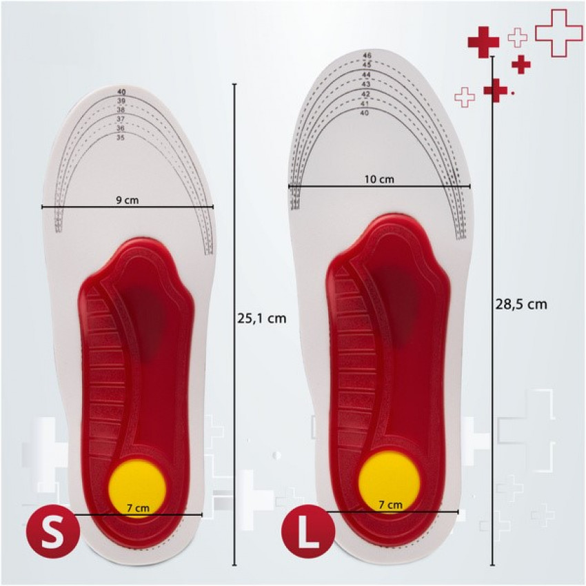Plastová podpera nielen stabilizuje prirodzenú klenbu chodidla, bráni jej splošteniu, ale tiež rovnomerne rozdeľuje záťaž a znižuje nepohodlie. Metatarzálna vložka účinne koriguje postavenie kostí chodidiel, najmä pri priečne plochých nohách, zlepšuje držanie nohy a zabraňuje ďalším deformáciám. Vložky sú navyše vybavené penovým tlmičom nárazov na päte, ktorý rovnomerne rozdeľuje tlak na pätovú ostrohu, čo výrazne znižuje bolesť a zaisťuje výnimočný komfort aj pri dlhodobom používaní.