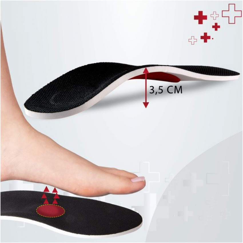 Zmiernenie bolesti a nepohodlia spôsobeného plochými nohami je zabezpečené precízne profilovanou podporou klenby chodidiel a metatarzálnou podložkou.