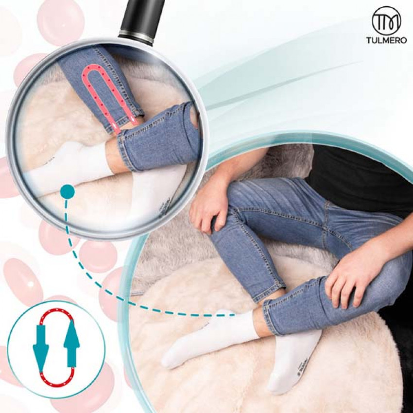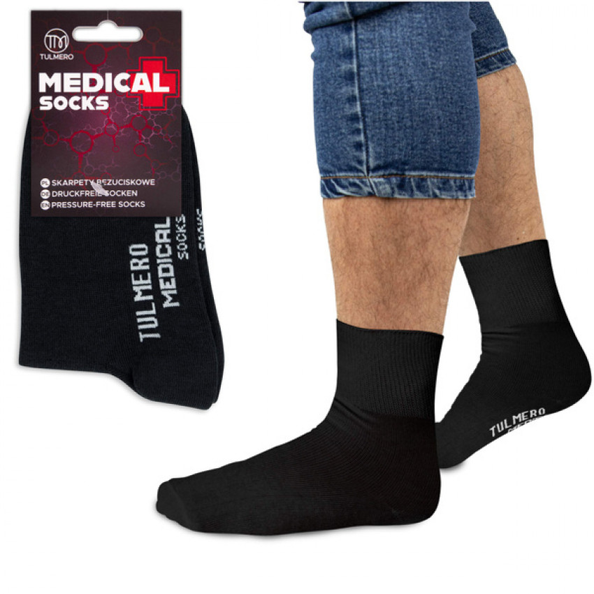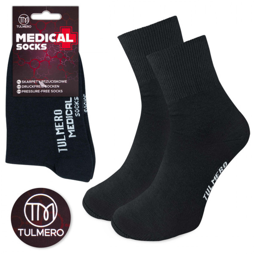 Bezpresné ponožky Tulmero Medical sú určené tak, aby znižovali tlak na chodidlá a lýtka. Umožňujú voľný prietok krvi a zabraňujú tlaku na citlivé oblasti chodidiel. Vďaka tomu môžu byť obzvlášť prospešné pre ľudí s citlivými nohami, opuchmi, žilovou nedostatočnosťou alebo inými cievnymi ochoreniami.