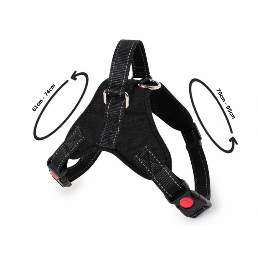 Postroj je vyrobený z materiálov, ktoré neťahajú a neničia srsť, nedráždia kožu. Je možné ho ľahko prispôsobiť obvodu krku a hrudníka vášho maznáčika. Je vybavený prídavnou rukoväťou a háčikom na vodítko. Ďalej tiež reflexnými prvkami, ktorých úlohou je zaistiť bezpečnosť pri prechádzke po zotmení.