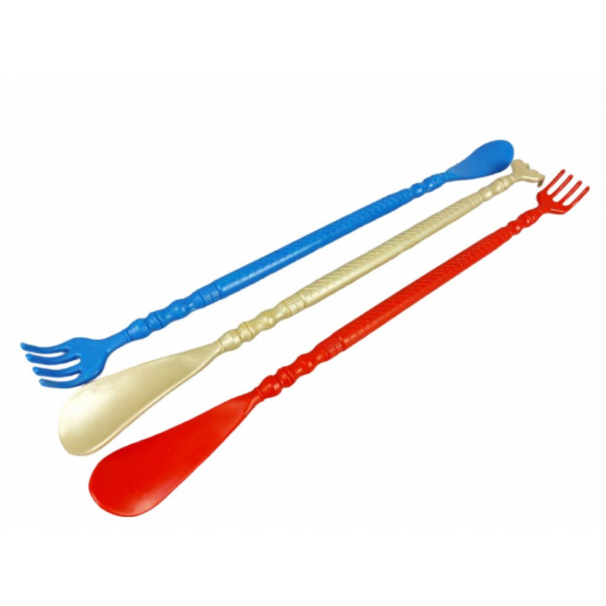 Masážna pomôcka má ergonomicky tvarované oválne telo, ktoré na jednom konci obsahuje masážny hrebeň a na druhom praktický obuvák na nazúvanie obuvi. Táto šikovná kombinácia nástrojov uľahčuje nielen obúvanie, ale aj poskytuje rýchlu úľavu od bolesti alebo svrbenia v tých najmenej prístupných miestach na vašom chrbte.