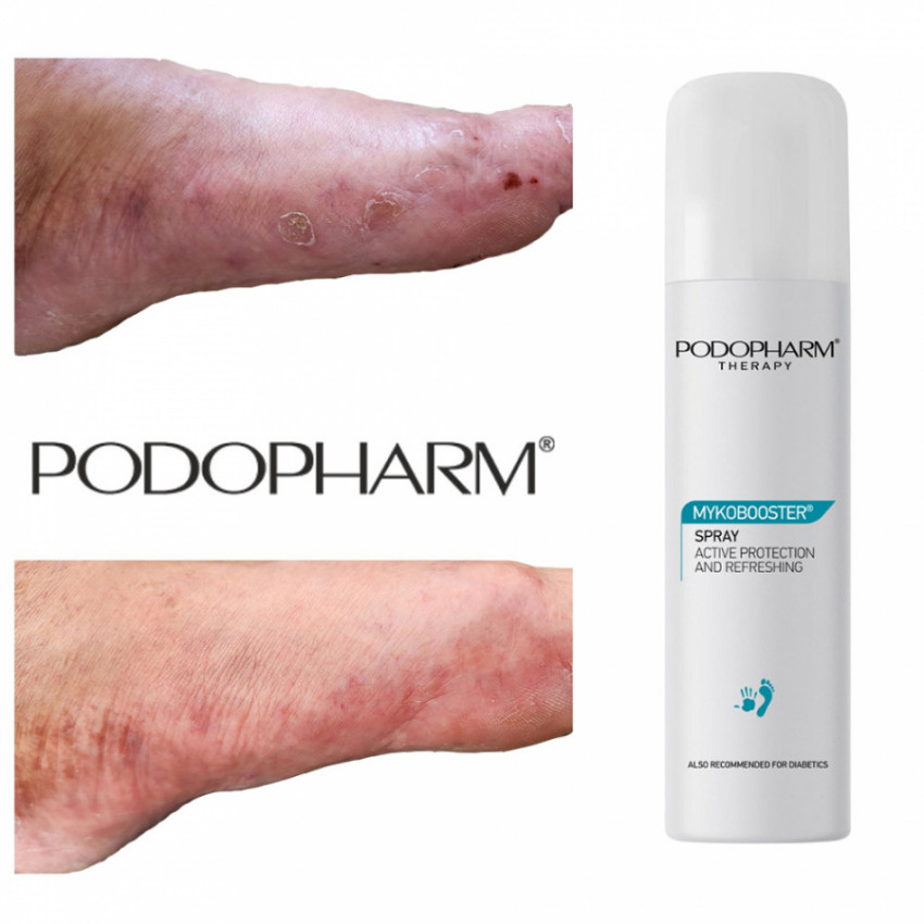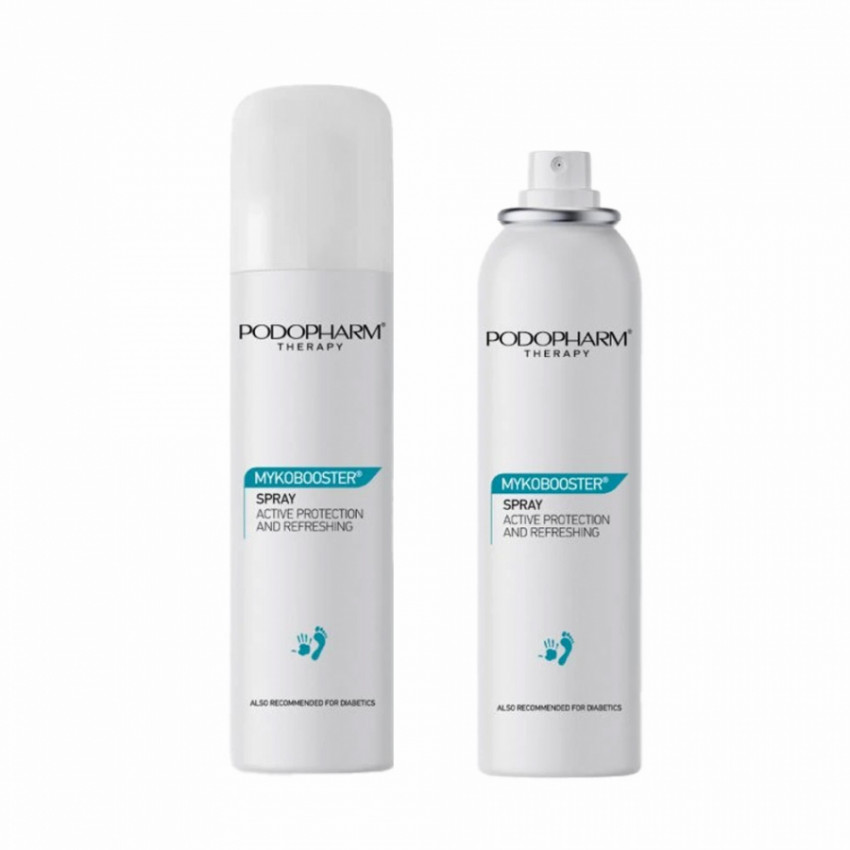 PODOPHARM MYKOBOOSTER SPREJ je vysoko účinný sprej určený na ošetrenie a ochranu nechtov a pokožky rúk a nôh pred plesňovými infekciami. Jeho zloženie obsahuje patentované komplexy aXophenone® a aXonnite Silver®, ktoré účinne ničia vírusy, plesne a baktérie, čím zabezpečujú dlhodobú antimikrobiálnu ochranu.
