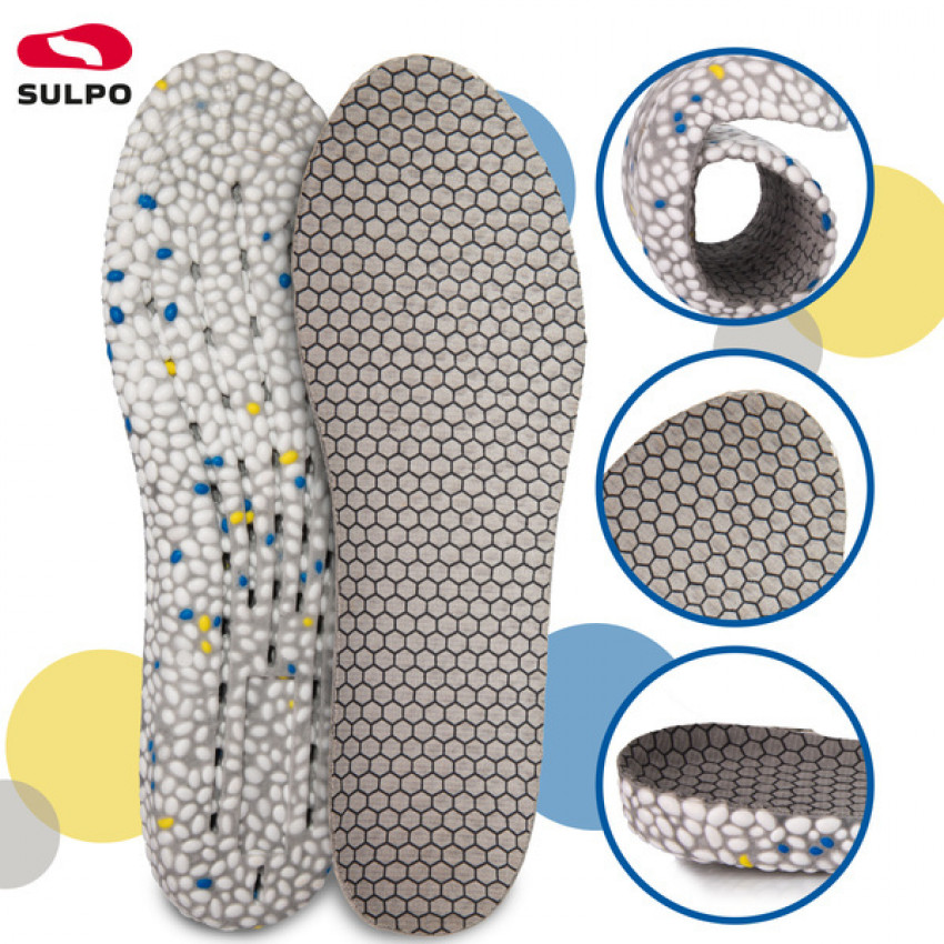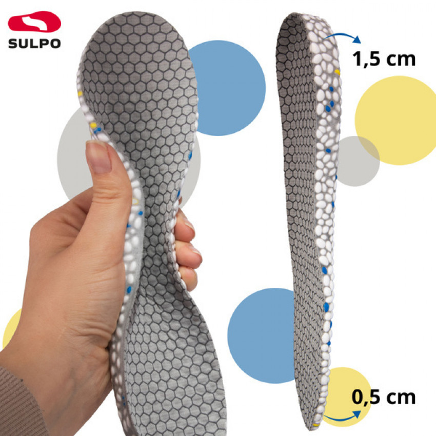 Vyvýšené vložky kombinujú anatomický dizajn s penou typu „popcorn“, ktorá zaisťuje vynikajúcu amortizáciu a stabilizáciu chodidla. Sú ideálnym riešením pre každodenné použitie – či už v práci, pri športe alebo na bežné nosenie.