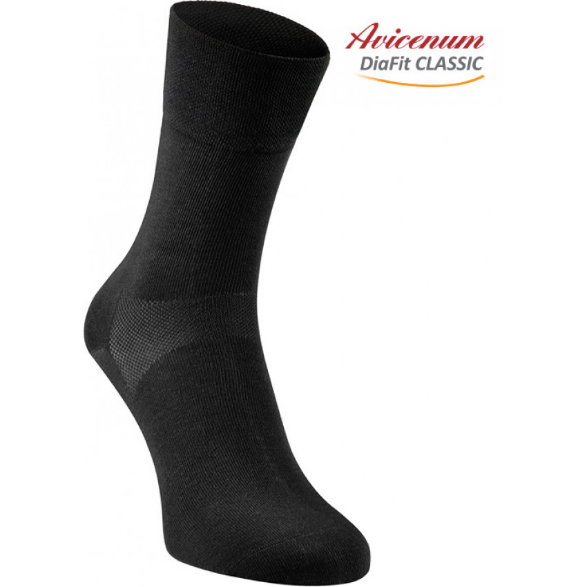 Ponožky vhodné pre diabetikov Avicenum Diafit CLASSIC sú vyrobené s 80% podielom dlhovláknej dvojmo stkanej bavlny. Zdravotný vaflový lem zabezpečuje jemné obopnutie nohy, je teda prevenciou škrtenia končatiny, pritom na nej dobre drží. Jemná retiazková špička je úplne plochá, bráni nebezpečným otlakom prstov na nohách diabetikov. Ukončenie špičky v palcovej a malíčkovej časti je bez prebytočných nití.