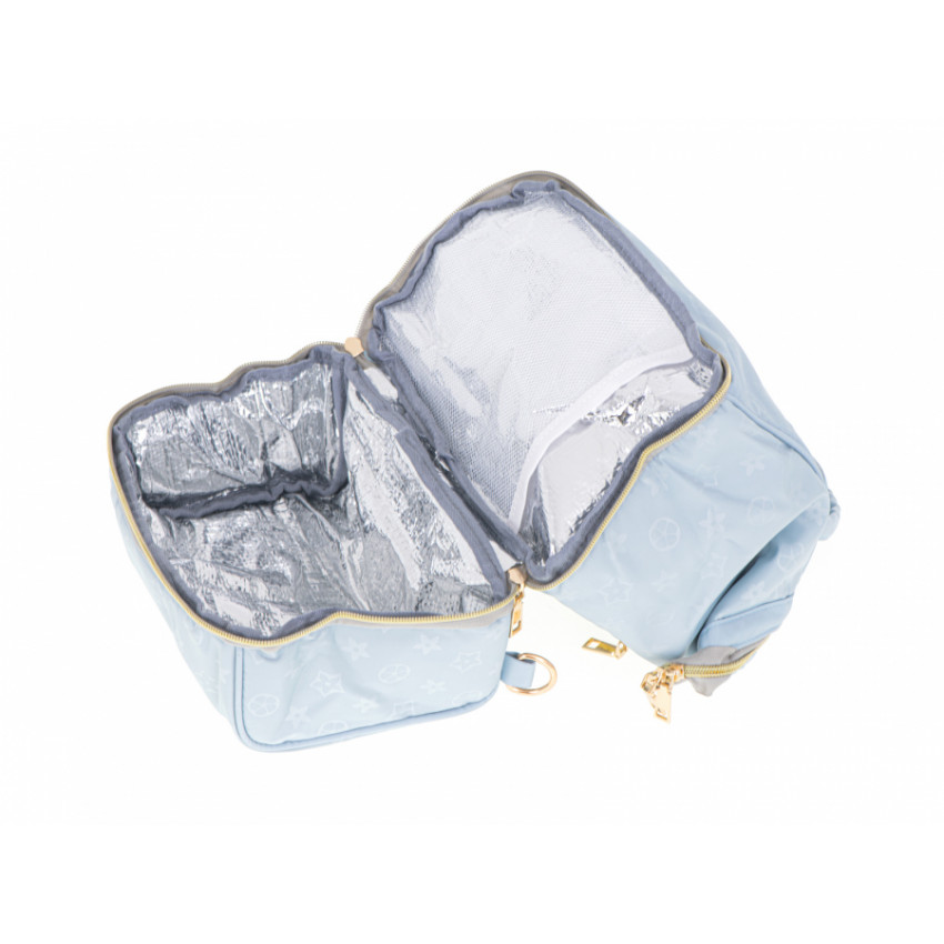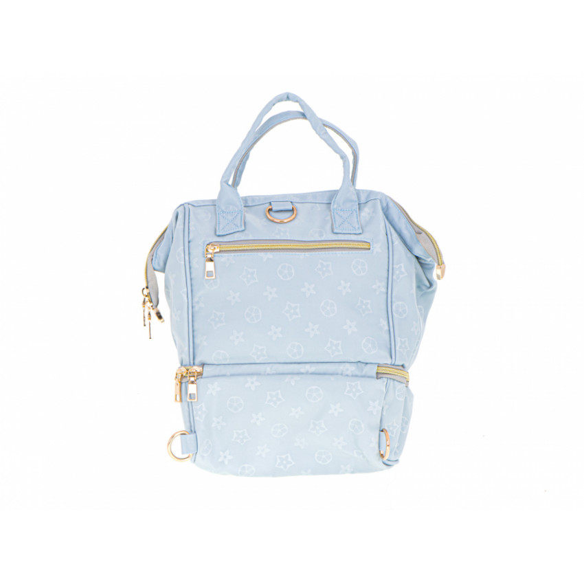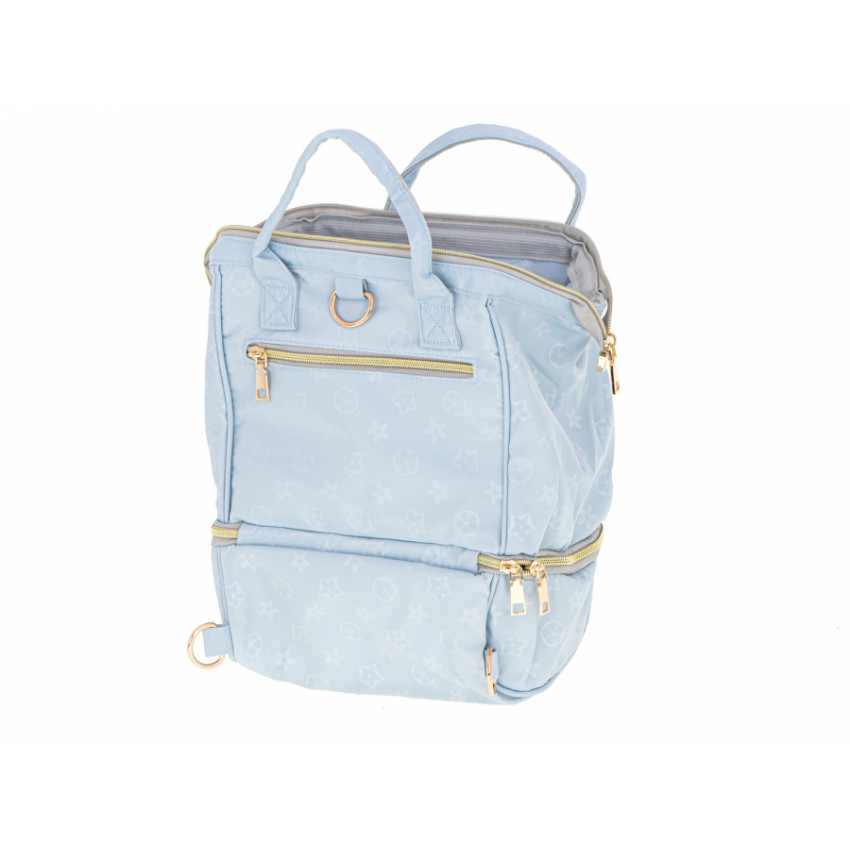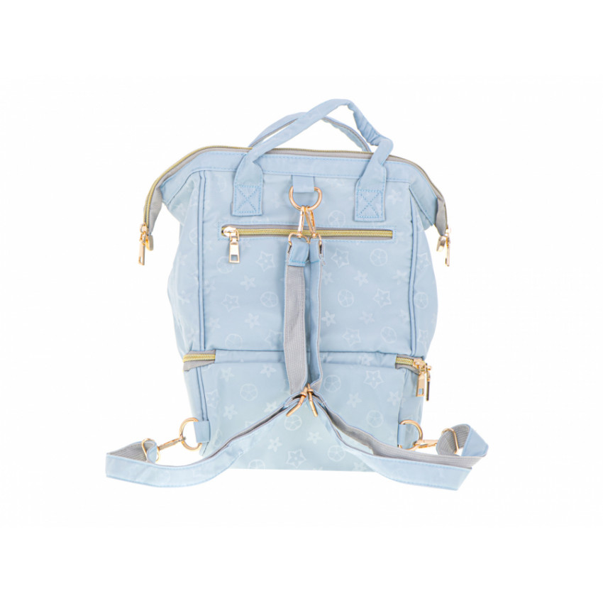 Praktická a elegantná taška pre rodičov modrej farby s jemnou potlačou. Môžete si do nej skryť všetky predmety potrebné na krátke aj dlhé cesty. Bude tam miesto pre fľaše na mlieko, plienky, vlhčené obrúsky a oveľa viac. Taška je vybavená dvoma rúčkami, ale pomocou pripevneného odnímateľného popruhu ju ľahko zmeníte na pohodlný batoh. Vďaka tomu získate slobodu voľných rúk.