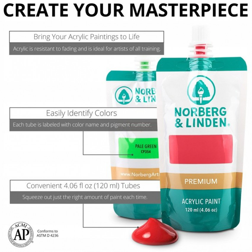Profesionálny set pätnástich zásobníkov 120 ml vysokokvalitnej akrylovej farby, pre dospelých a deti, začiatočníkov a profesionálov. Jemná, ľahko miešaná akrylová farba, vysoko adaptabilné na miešanie nekonečných farebných kombinácii. Môžete tiež experimentovať s použitím štetcov a paletových nožov a vytvárať textúry.