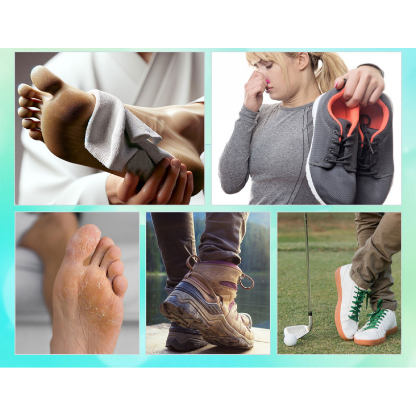 Vložky pomáhajú predchádzať nepríjemnému zápachu nôh a nepohodliu spôsobenému množením baktérií. Dezinfekčný prostriedok likviduje baktérie a neutralizuje pachy.