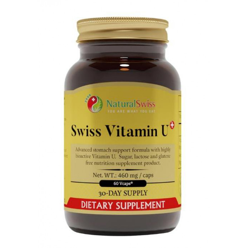 Vitamín U, na rozdiel od svojho názvu, sa nezaraďuje medzi vitamíny. V skutočnosti ide o derivát aminokyseliny. Jeho fungovanie sa skúma už od 30. rokov 20. storočia. Často sa používa v rámci doplnkovej liečby pacientov trpiacich vredmi. Vysoký obsah prírodných zložiek vo vegánskych kapsulách Swiss Vitamin U podporuje zdravie črevnej sliznice a stien žalúdka.
