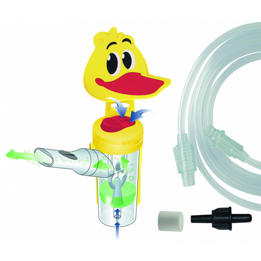 Voliteľne použiteľné s týmto zariadením: Detský rozprašovač "kačacia tvár" Inhalačná hra Jordi Stick pre deti pre inhaláciu priateľskú deťom s hrou, Zábava a kontrola správnej inhalácie Súprava tryskového rozprašovača, univerzálna vrátane 2 masiek, náustku, hadicovej spojky