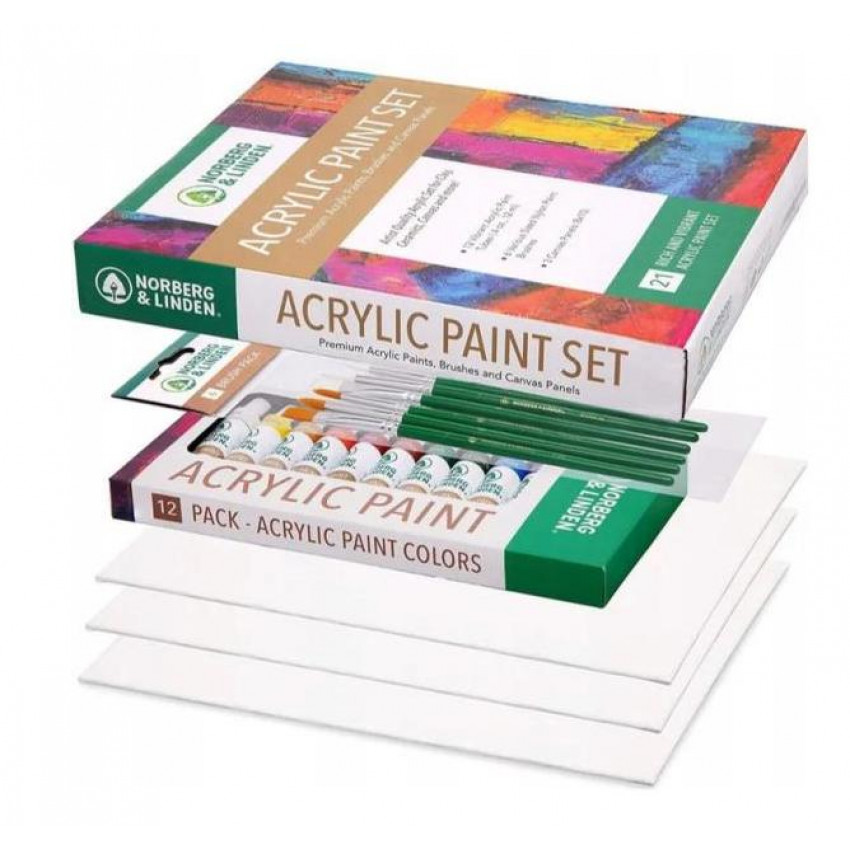 Sada akrylových farieb - 12 akrylových farieb, 6 štetcov na akrylové maľovanie, 3 maliarske plátna - Maliarske potreby na plátno 21 ks