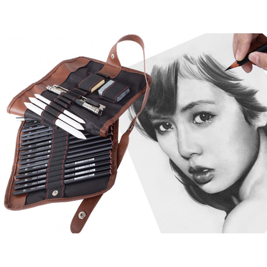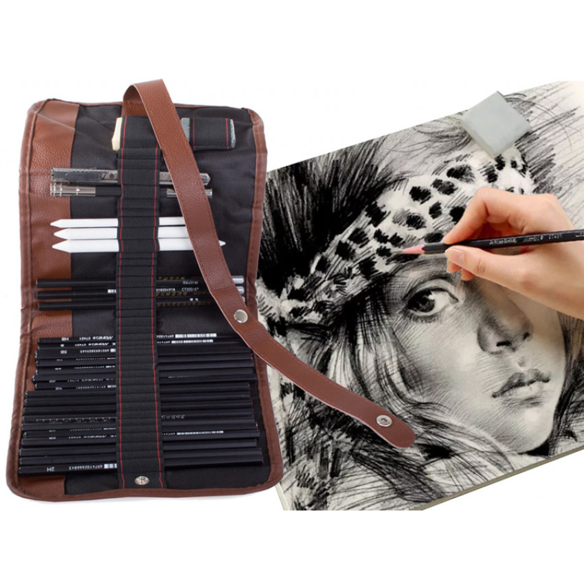 Sada obsahuje 29 kusov, vrátane rôznych ceruziek, uhlíkov, gúm a ďalších príslušenstiev.
