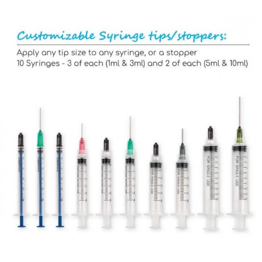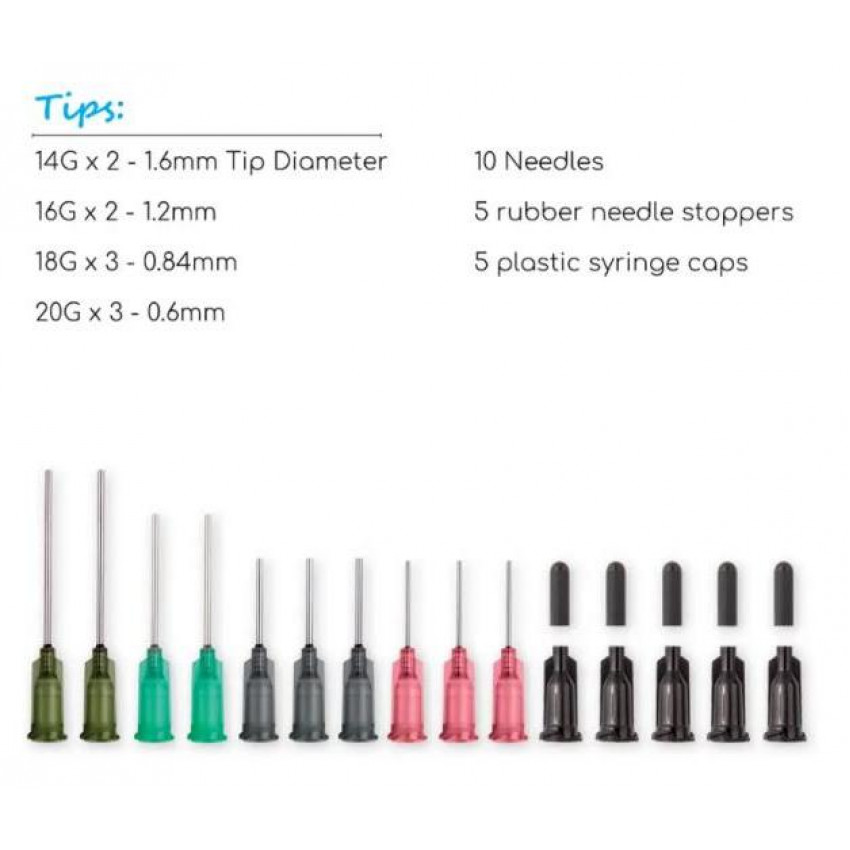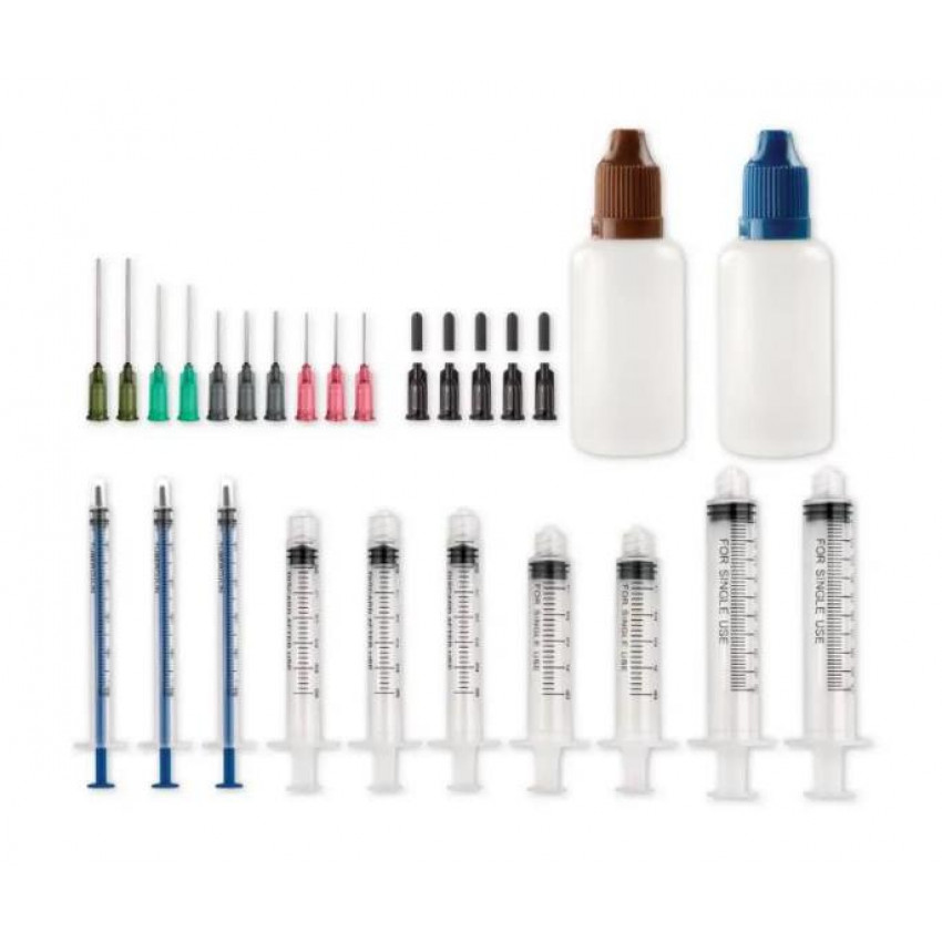 Sada injekčných striekačiek s tupými ihlami a fľaštičkami na zdobenie. Široká škála aplikácií aplikátorov pre použitie na éterické oleje, hobby produkty, tmely, presné priemyselné aplikácie, plniace a meracie kvapaliny, lepidlá, aplikátory olejov alebo lepidiel, výroba šperkov, elektronické súčiastky.