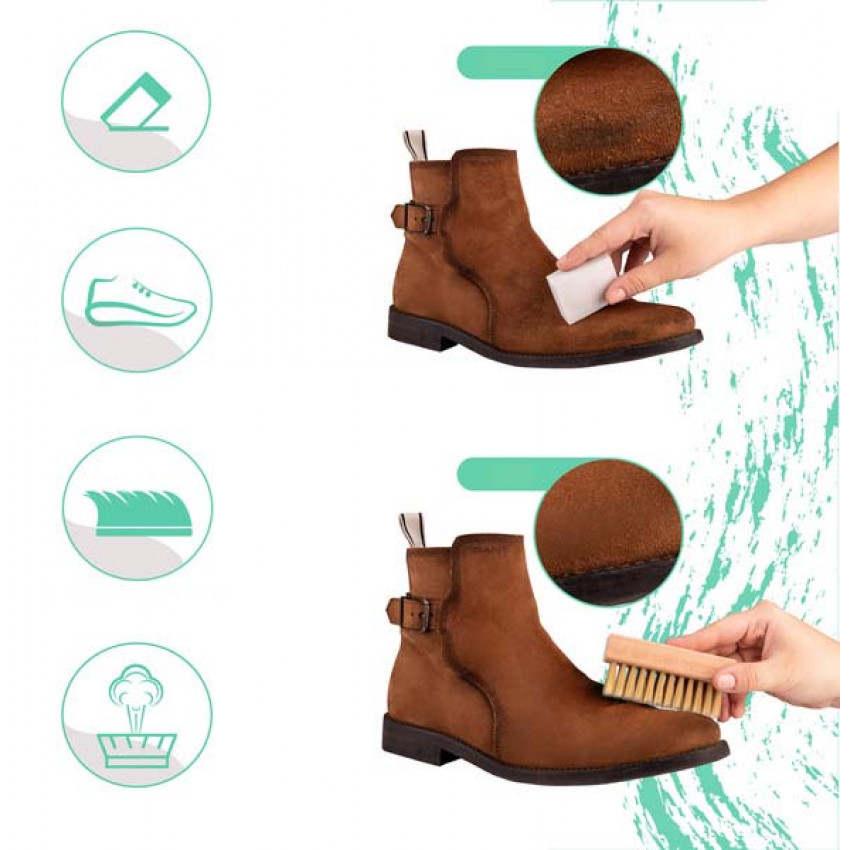 Súprava je určená na pravidelnú údržbu a čistenie obuvi. Čistiaca guma je špeciálne určená na odstránenie nečistôt z materiálu bez poškodenia jeho štruktúry. Kefa s mäkkými štetinami účinne odstraňuje prach a poskytuje obuvi čistý a upravený vzhľad.