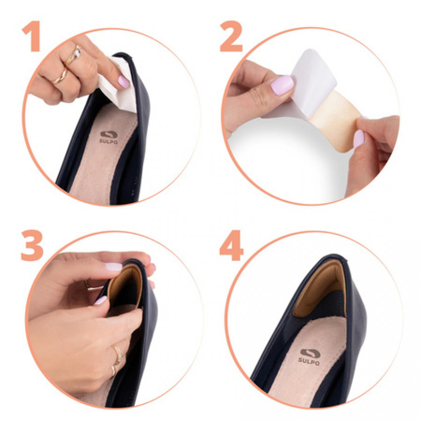 Postup je jednoduchý. Najprv očistite vnútro topánky, odstráňte ochrannú fóliu a umiestnite pätný pult do zadnej časti obuvi. Potom pritlačte a počkajte niekoľko minút, kým lepidlo začne pôsobiť.