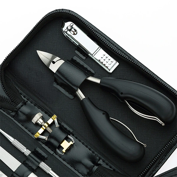 Jej súčasťou sú klieštiky na nechty navrhnuté aj pre tvrdé alebo zarastené nechty, exkavátory na čistenie a ošetrenie nechtového lôžka, oceľový pilník pre úpravu dĺžky a tvaru a ďalšie pomocné nástroje. Každý z nich má svoje jasné miesto v elegantnom praktickom puzdre, ktoré je ideálne nielen na uskladnenie, ale aj na cestovanie.