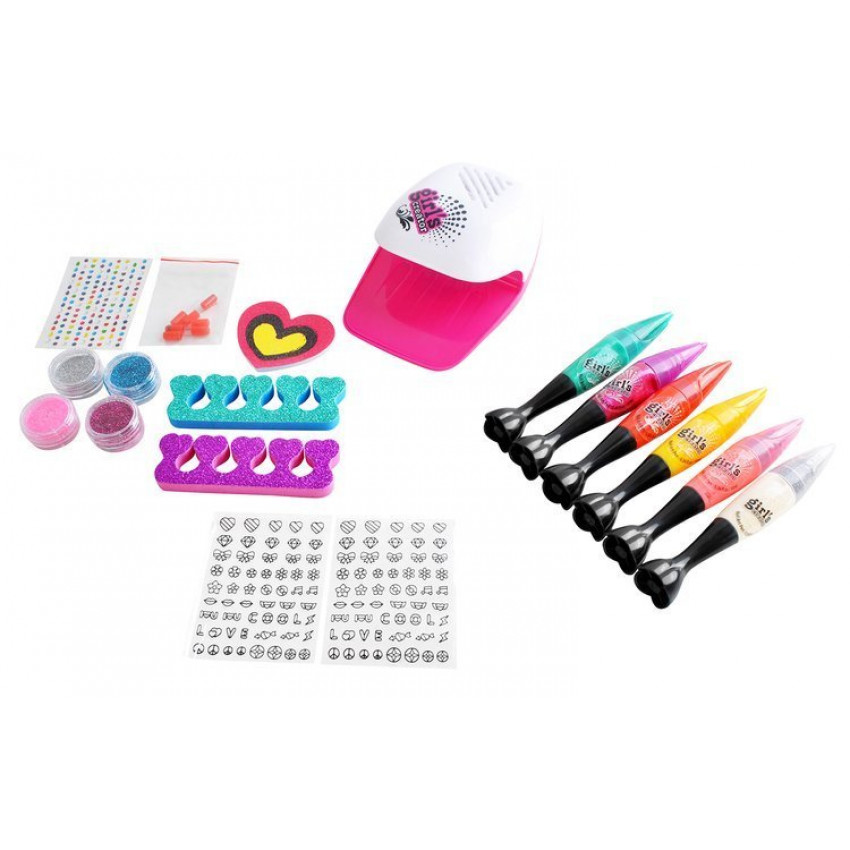 Rozvíjajte kreativitu a estetické cítenie vašej malej slečny s touto sadou, ktorá obsahuje všetko potrebné pre manikúru. Súčasťou sú lampa na schnutie nechtov, nálepky a ozdobné kamienky, 7 lakov 2 v 1, oddeľovače prstov a pilník na nechty.