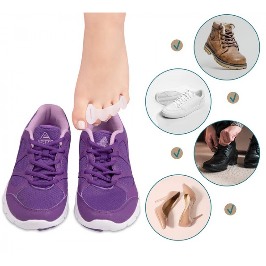 Oddeľovače môžete nosiť neustále, deň či noc. Nastaviteľné kliny umožňujú prispôsobenie priestoru medzi prstami podľa individuálnych potrieb, čo zabezpečuje rýchle a efektívne výsledky. Mäkký materiál sa ľahko prispôsobí tvaru vašej nohy a je kompatibilný s rôznymi typmi obuvi.