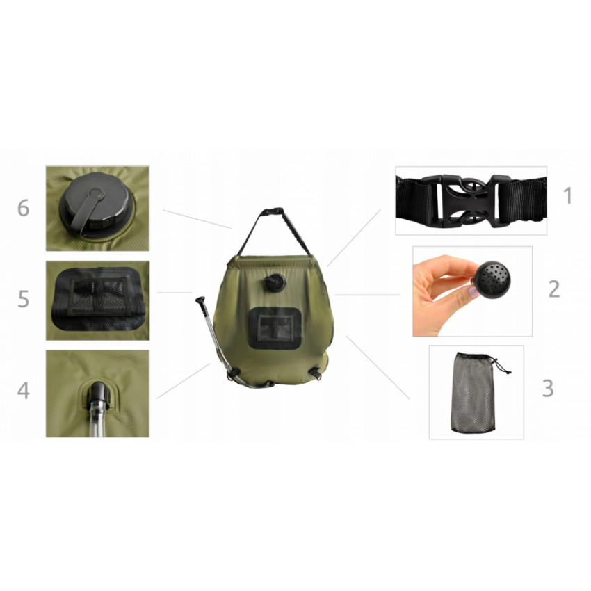 Sprcha má dvojité vrecko, ktoré vám umožní ukladať malé predmety potrebné na kúpanie, napr. šampón, gél. Ak chceme, aby bol kohútik hore, jednoducho ho zaveste. Vodovodný kohútik má sprchovú špičku 40 centimetrov, ktorú stačí vytiahnuť, aby mohla voda pretekať a po použití stačí zavrieť prívod vody. V hornej časti je tiež gumová rukoväť na pohodlné prenášanie, ako aj zavesenie, na oboch stranách v dolnej časti sú tiež dve rukoväte, vďaka ktorým zaistíme pevnejšie zavesenie, napríklad na strom.