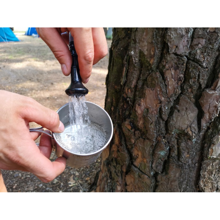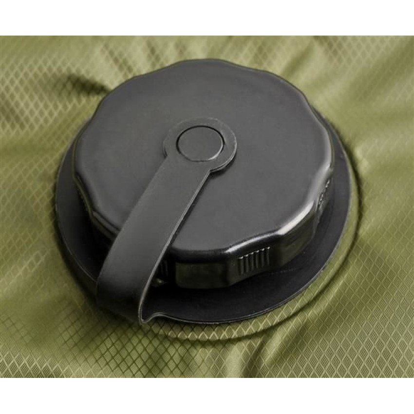 Kempingová sprcha je zaistená gumou, ktorá zabraňuje úniku vody - nalievanie vody je mimoriadne ľahké. Okrem toho je korok na popruhu, takže nehrozí jeho strata.