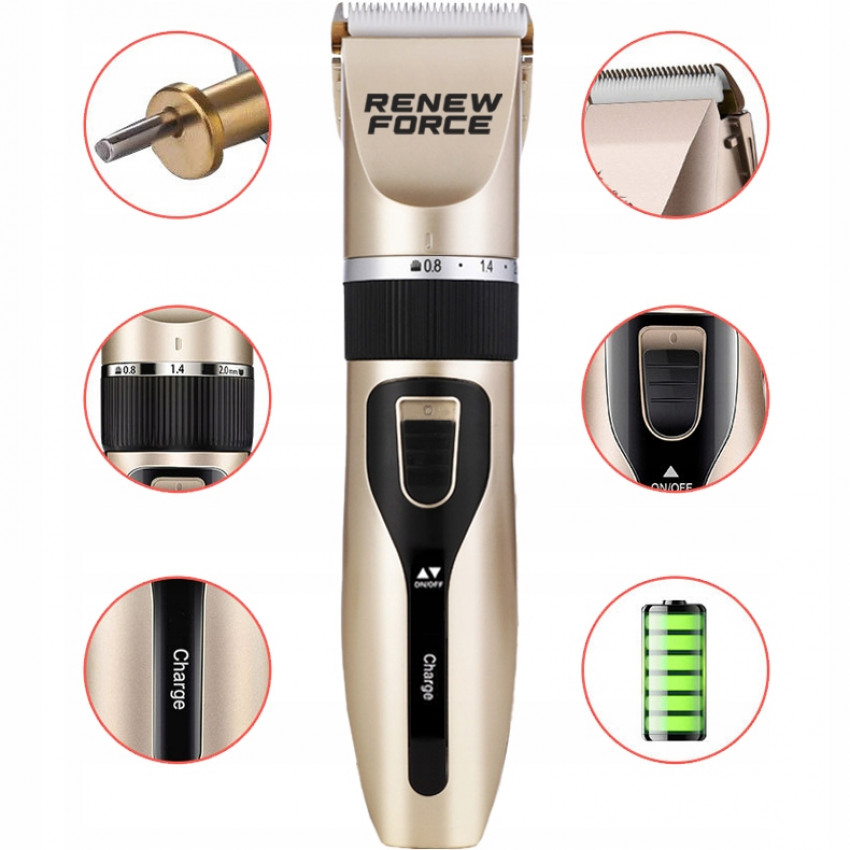 Keramické čepele zabezpečujú presný strih srsti, s možnosťou manuálneho nastavenia dĺžky štetín bez nadstavcov. Ergonomický dizajn umožňuje presné strihanie a vstavaná kapacitná batéria poskytuje až 90 minút práce.