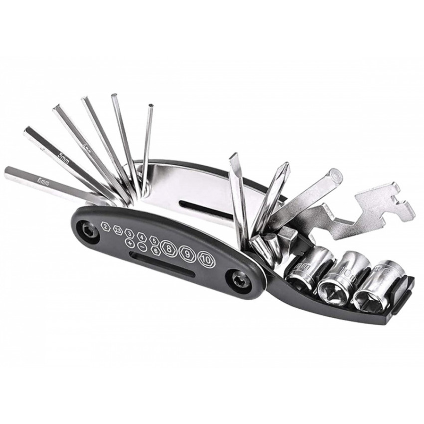 Sada kľúčov na bicykel! Veľmi praktická a priestorovo nenáročná vychytávka pre každého náruživého cyklistu. Odteraz budete vykonávať akúkoľvek menšiu opravu svojho bicykla na ceste bez toho, aby ste so sebou nosili asi tucet nástrojov samostatne! Sada obsahuje 16 nástrojov na údržbu a drobné opravy bicykla. Celé je to uzavreté v šikovnom a kompaktnom vreckovom nožíku. V zloženom stave ľahko padne do ruky, ľahko sa skladuje a nezaberie veľa miesta v cyklistickej taške alebo kufri. Sada obsahuje imbusové kľúče, skrutkovače, nástrčky s adaptérom, ale aj ploché kľúče a špeciálny 14GE kľúč na lúče.